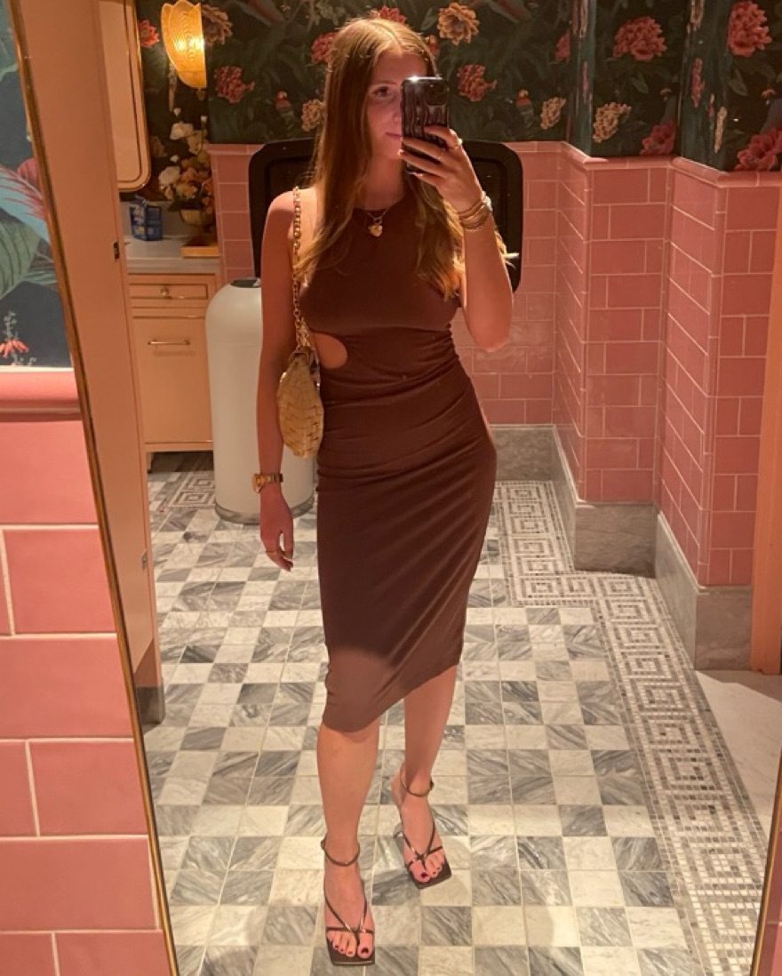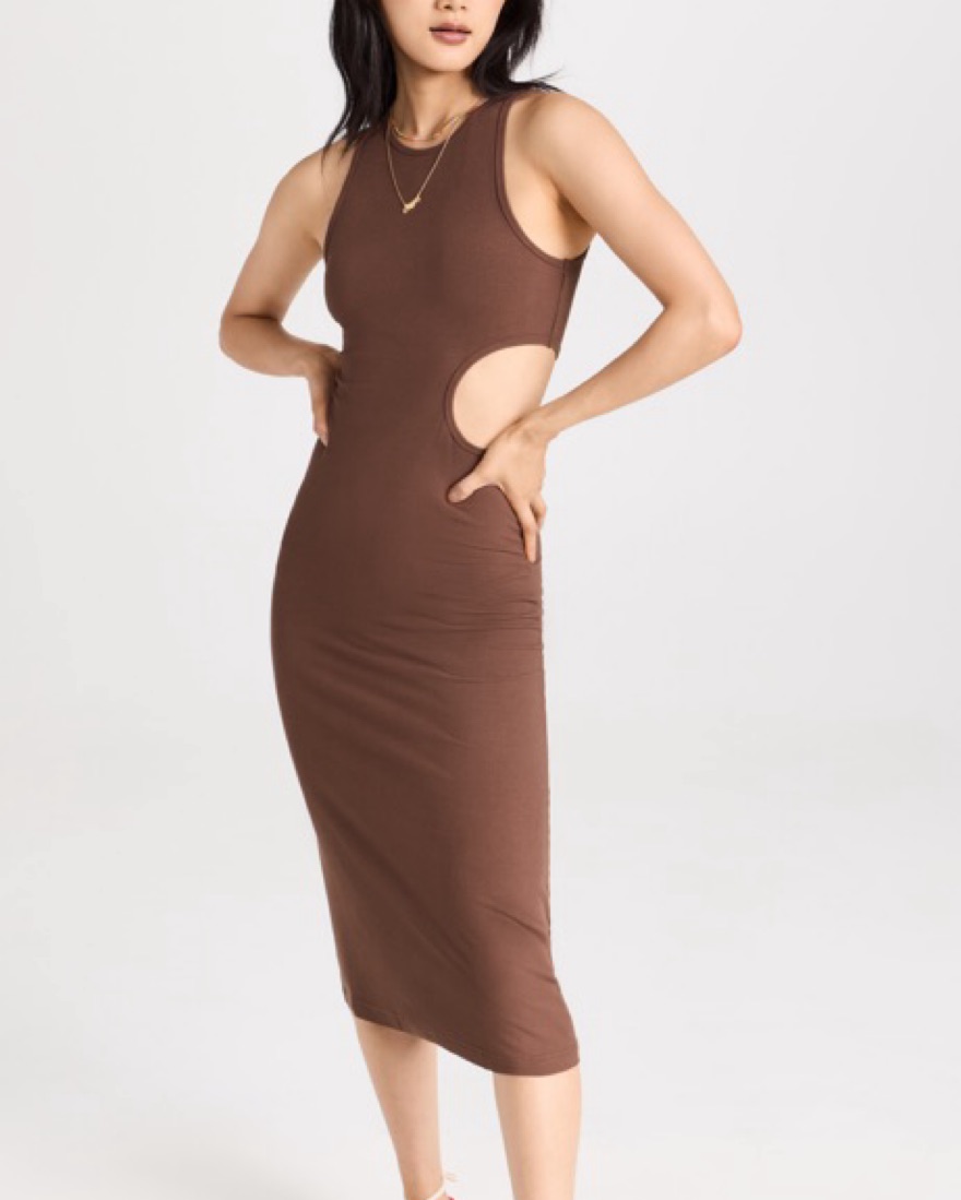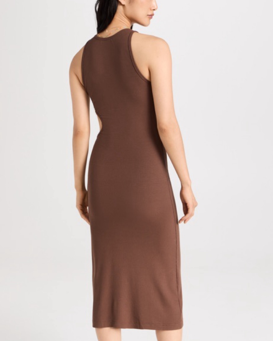 Brown tank ribbed dress with cutout on ribs. Easy to dress up or down