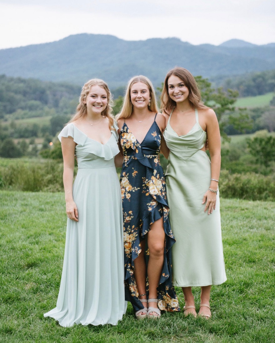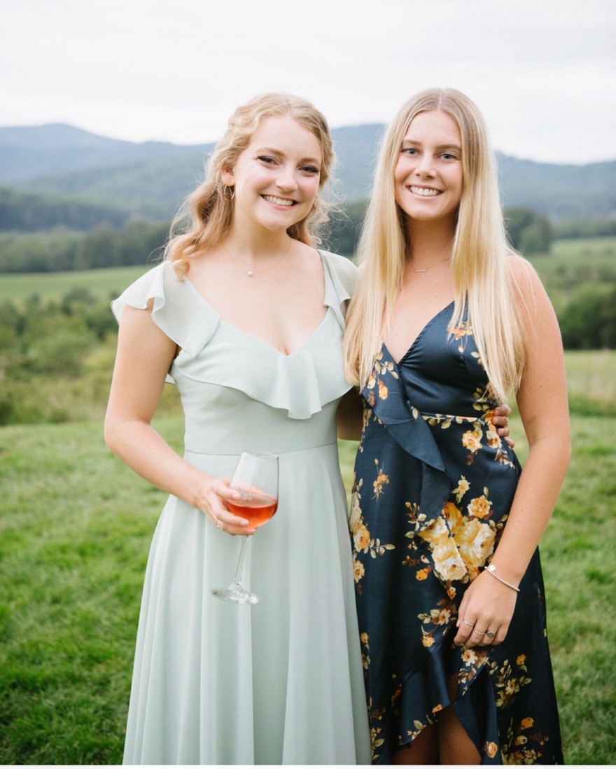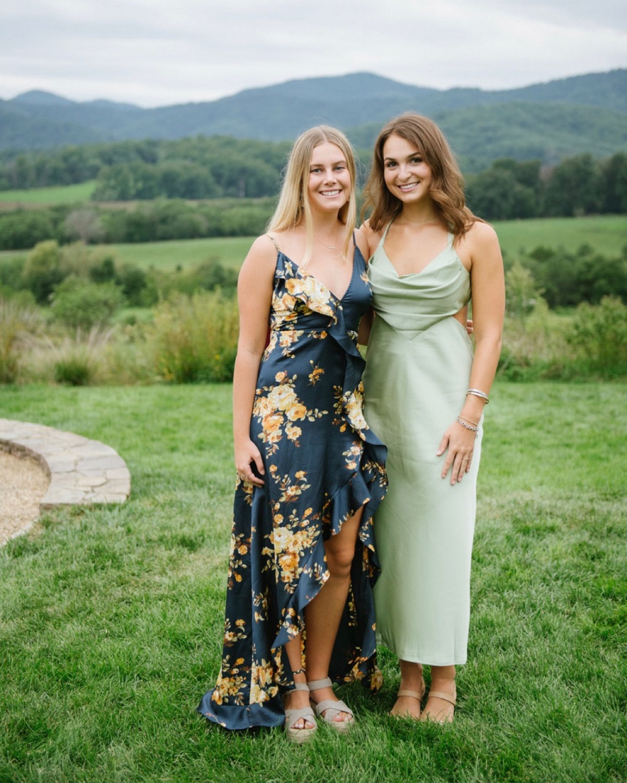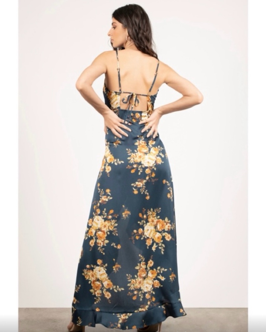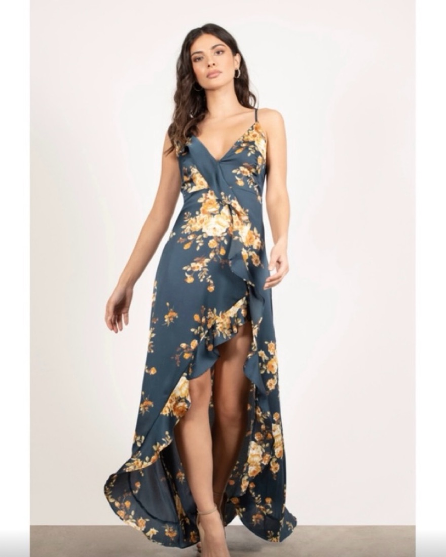Navy blue dress with gold flowers. Has ruffles and large slit down one side.