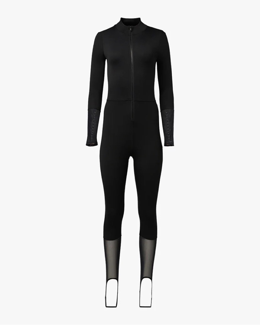 This mock neck jumpsuit is made from brushed nylon with warm fleece lining and power mesh panels at the back, sleeves, and legs for breathability. Stirrup foot straps and thumbholes help keep the legs and sleeves in place.