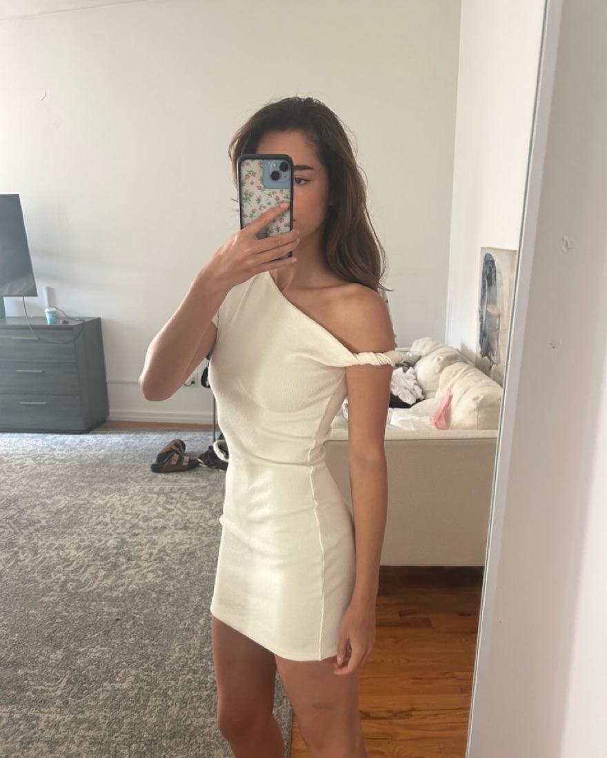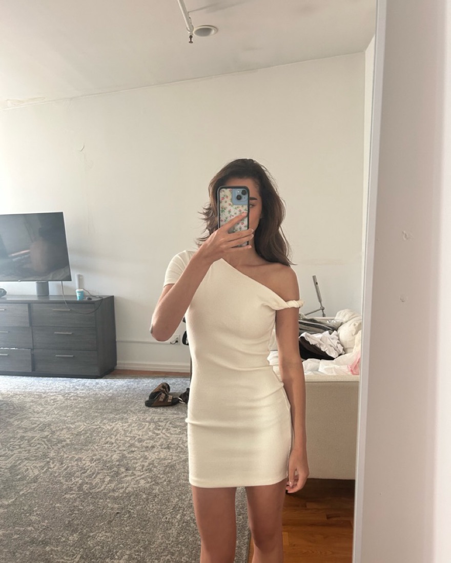 Beautiful white mini dress. This fabric is body hugging and stretchy for ultimate comfort and easy wear. Featuring asymmetrical neckline and a signature twist strap, one off-the shoulder exposing your décolletage.