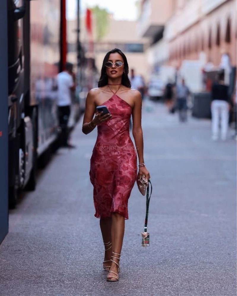 This stunning floral midi dress is perfect for a summer garden party or a night out on the town. The vibrant pink and red floral pattern creates a bold and stylish look.