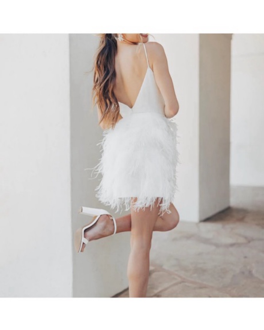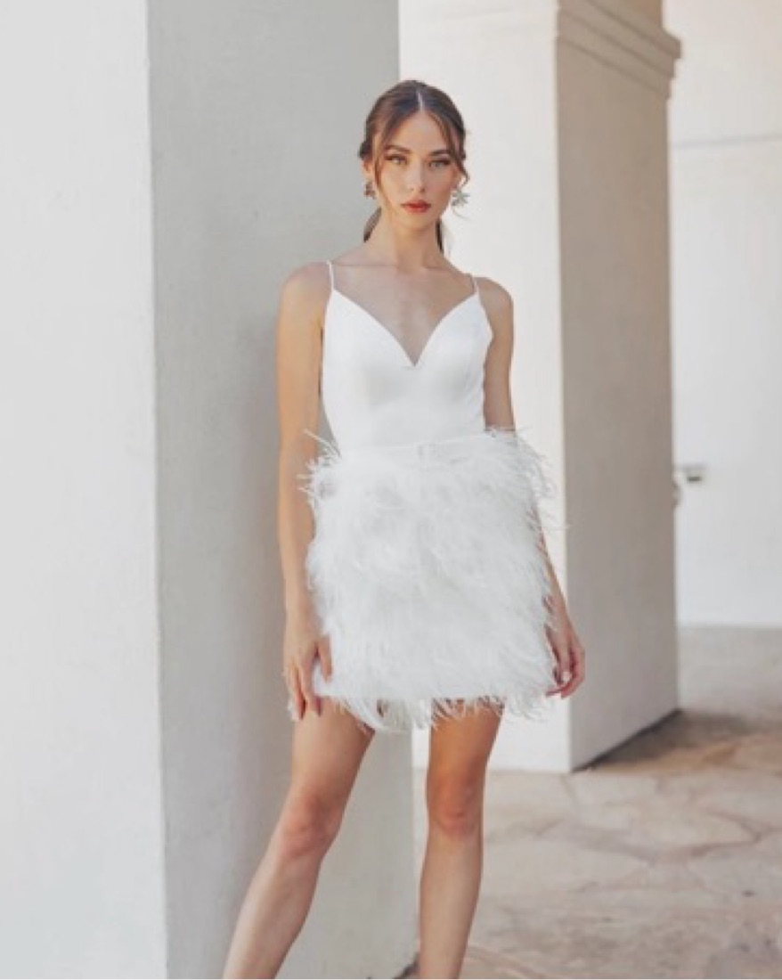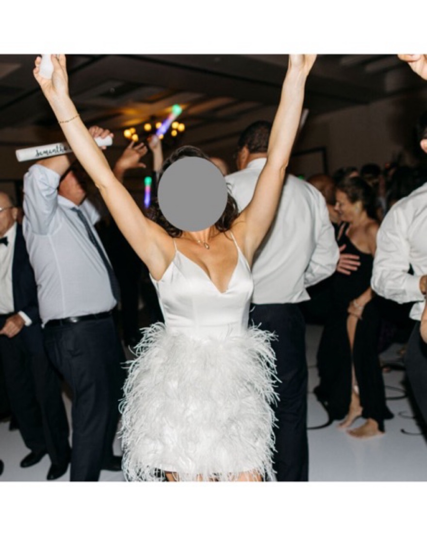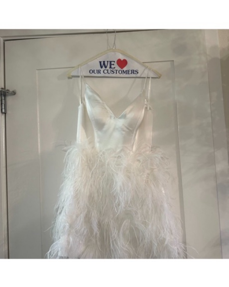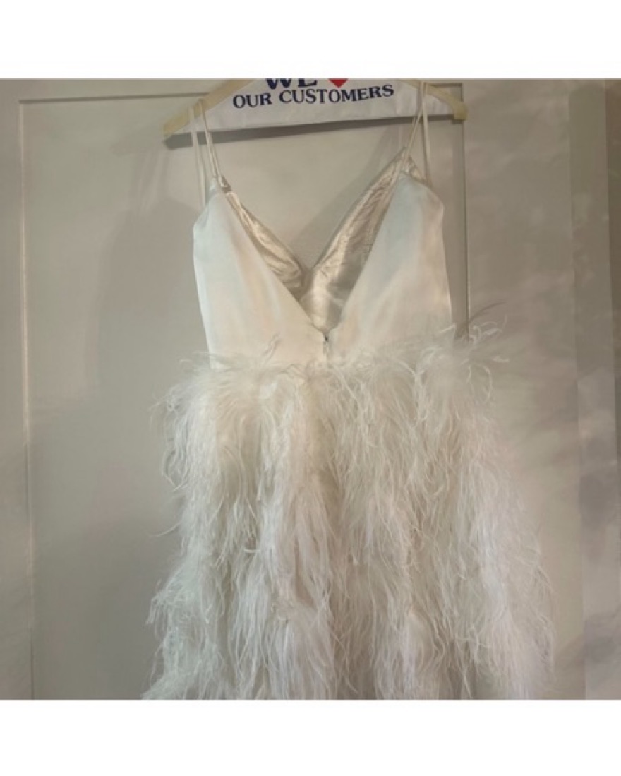 Beautiful feather mini with satin bodice and spaghetti straps. Bodice has 6 pieces of boning structure and built in cup support. Zipper back with hook and eye closure.
