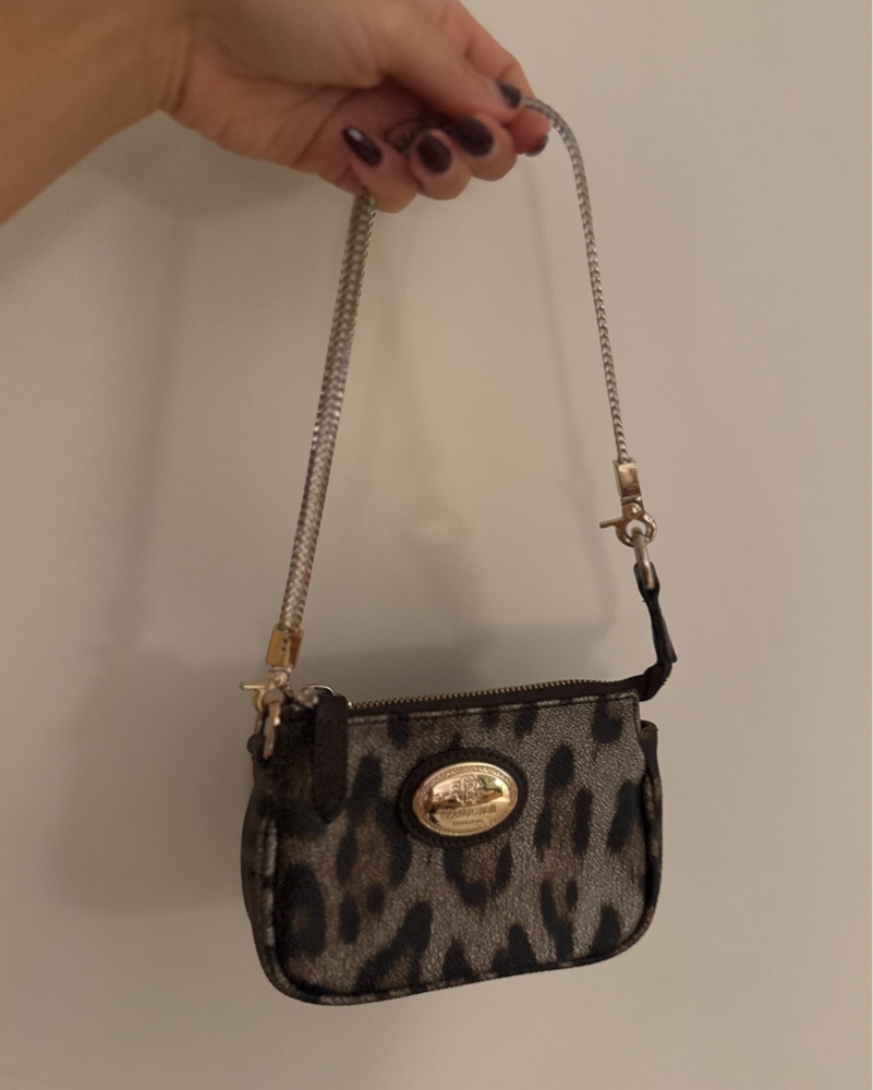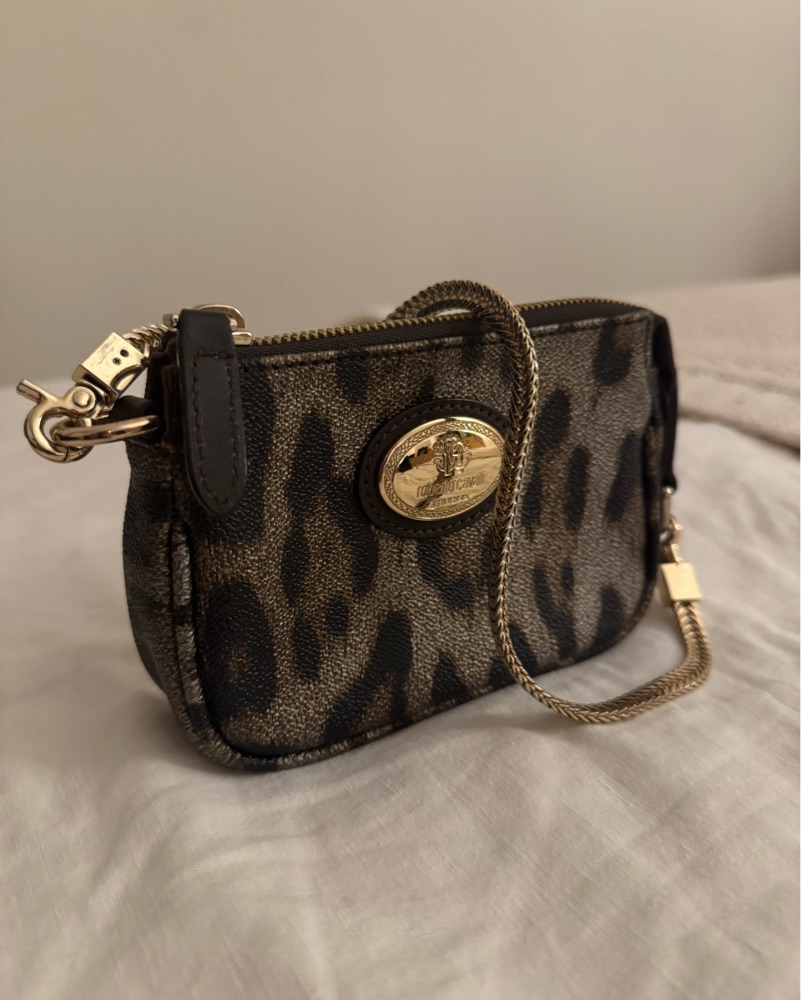Roberto Cavalli Leopard Clutch/Mini Bag with gold hardware. Can be worn as a mini bag or chain can be removed as a clutch or bracelet clutch. Super mini and cute but don’t be deceived- can fit keys, cards, lipgloss, AirPods, hand sanitizer/roller perfume! :)