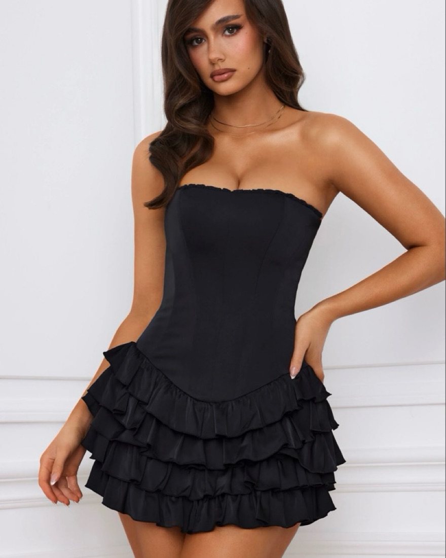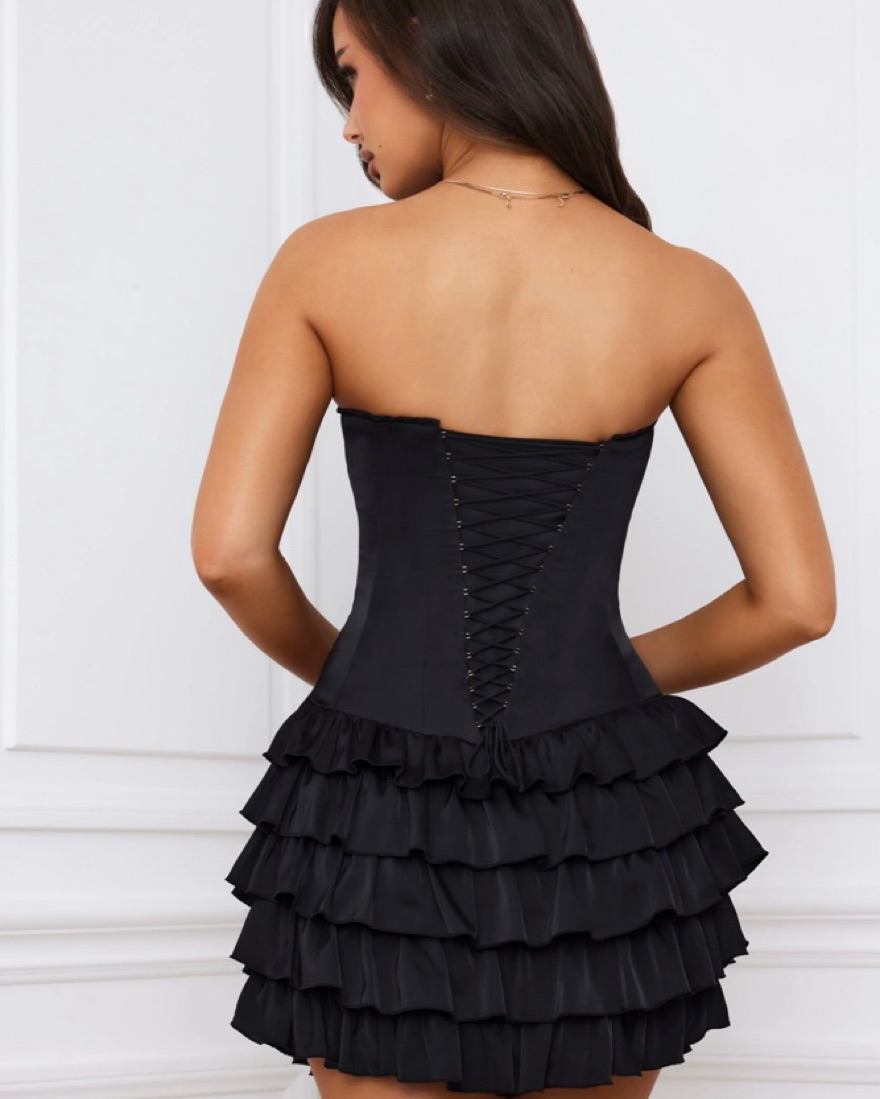 This is the Juliet, Bandeau Ruffled Tiered Corset Mini Dress in Black in a Size 2. I usually wear xs - small.