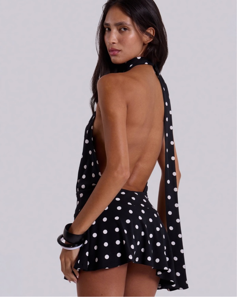 NEW Enya asymmetric backless mini dress in off-black and white polkadot with fitted dropped waistband, scarf tie detail at neck and flared asymmetric skirt