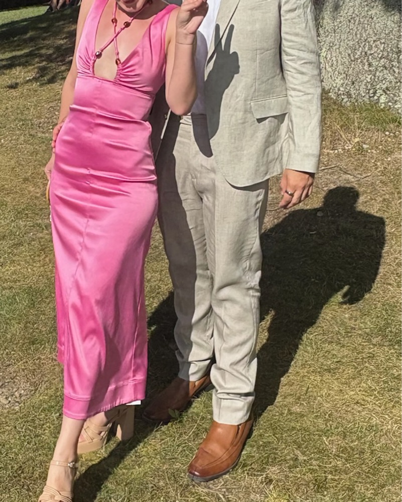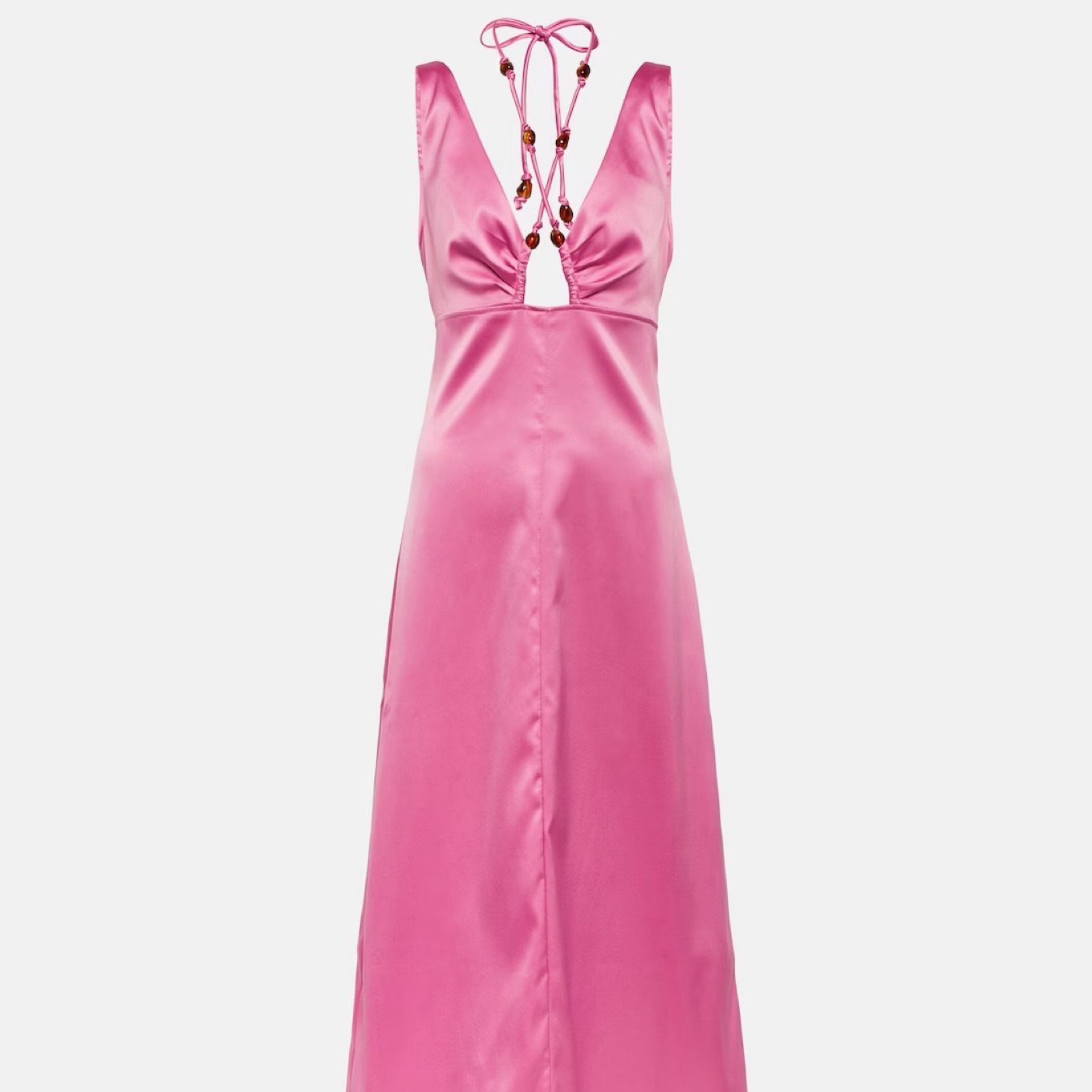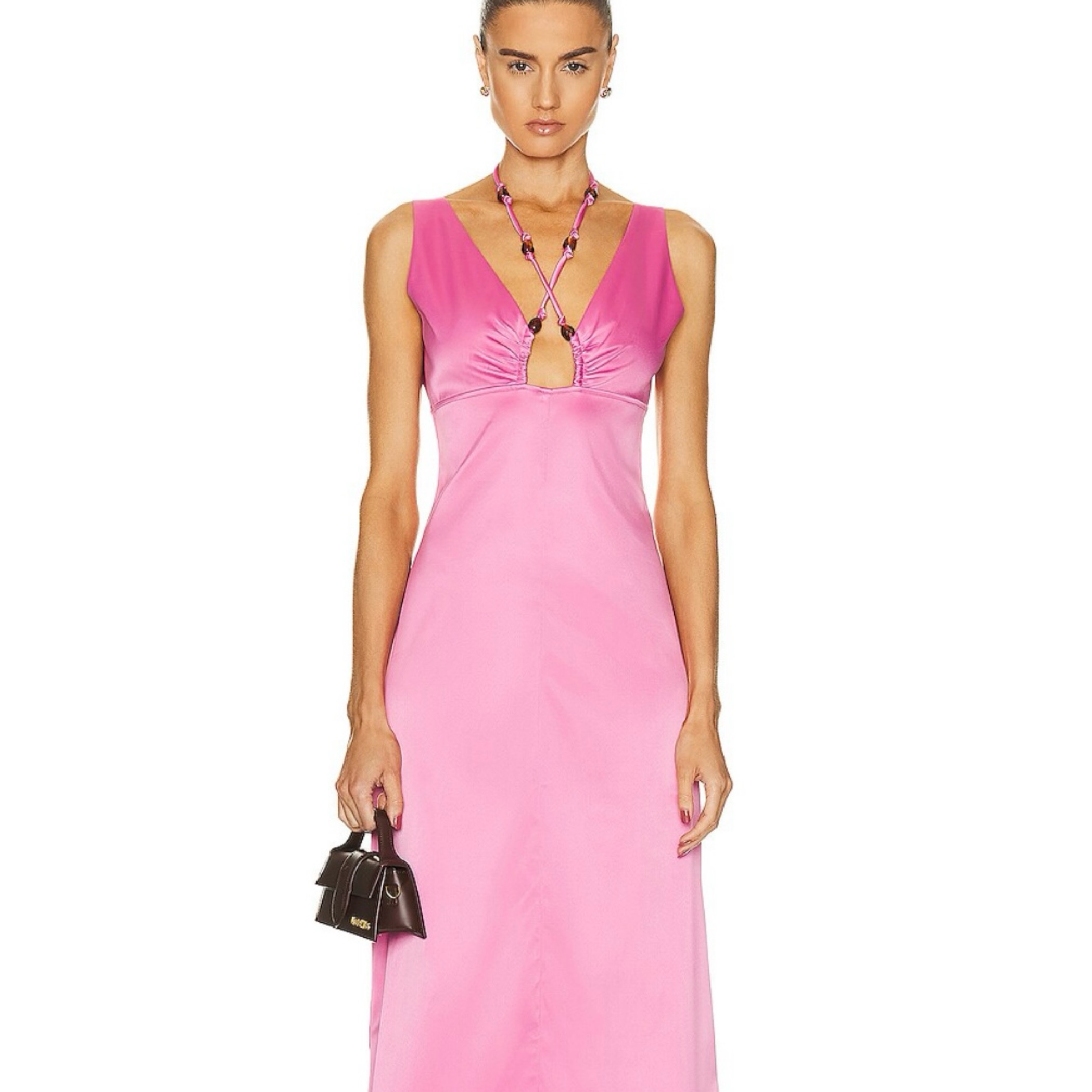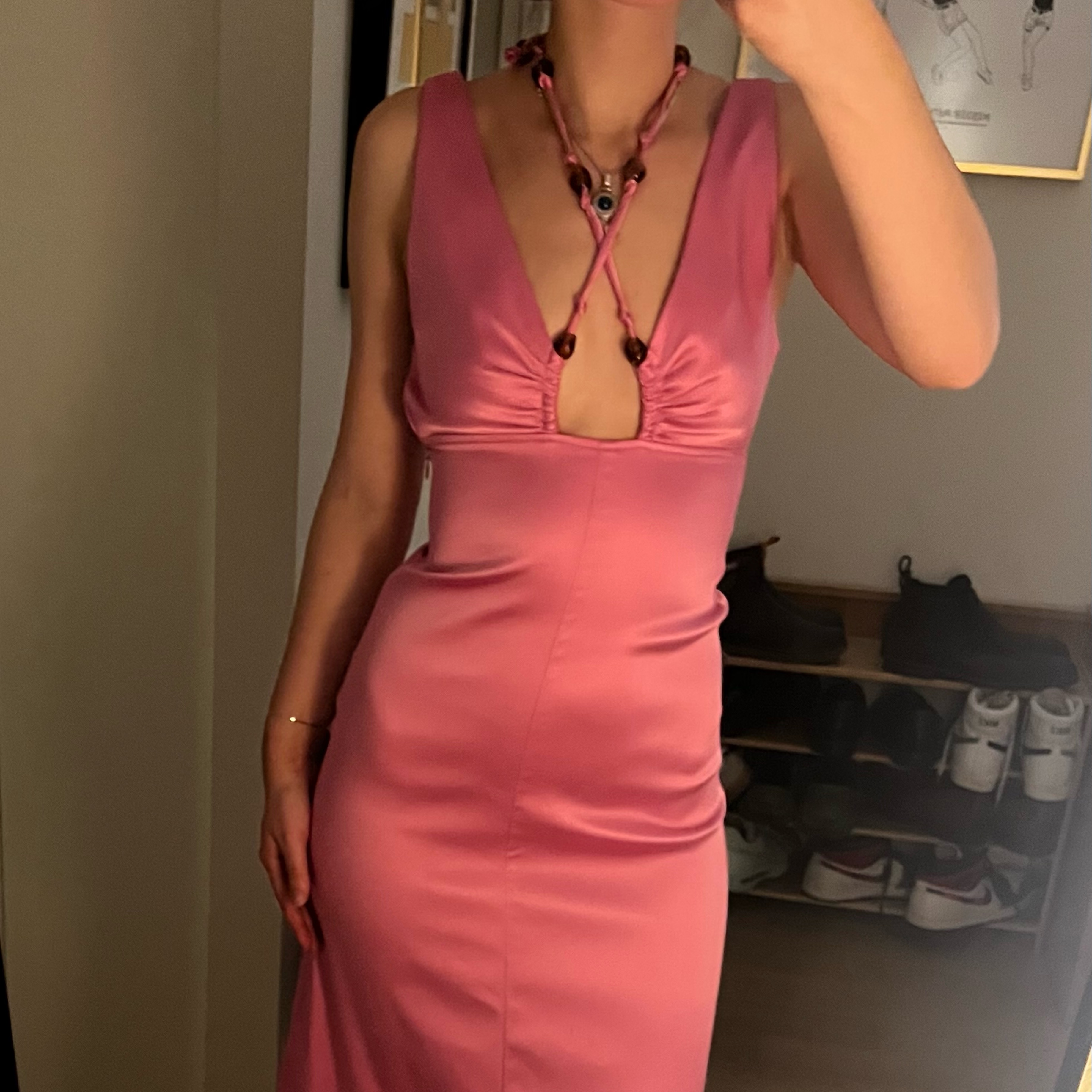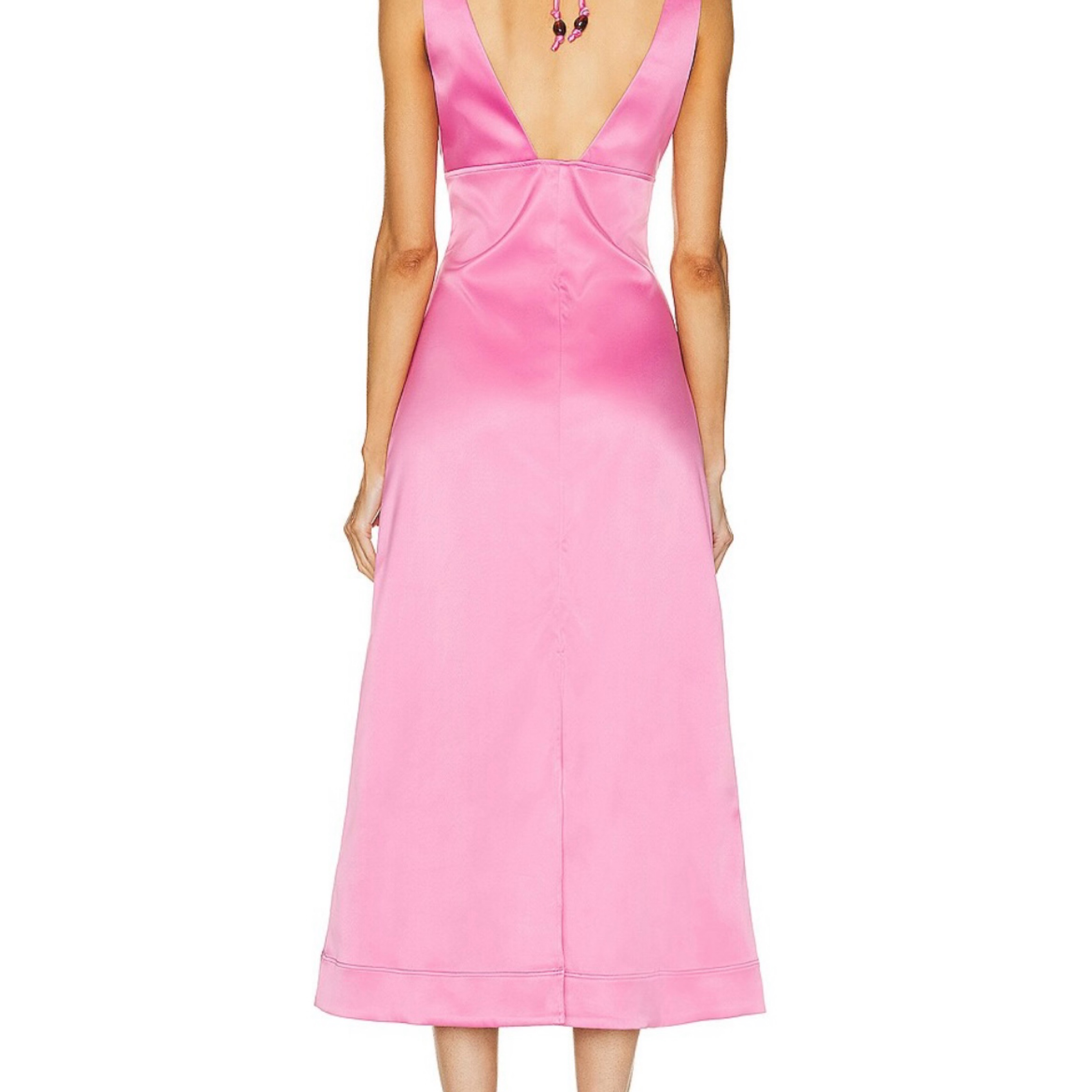 Gorgeous pink satin gown from Ganni. Halter tie has beaded detailing and it goes right above my ankles (5’4) Its marked as a petite but sizing is equivalent to a FR 32 or 0