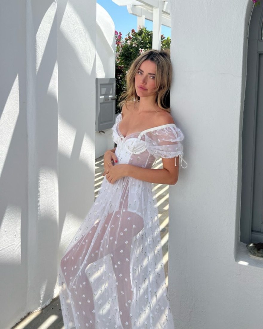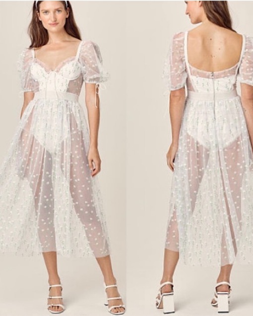 For the dreamers. Cascading floral embroidered tulle maxi dress featuring puff sleeves and a built-in stretch satin bodysuit. Delicate ties at sleeve opening and neckline.