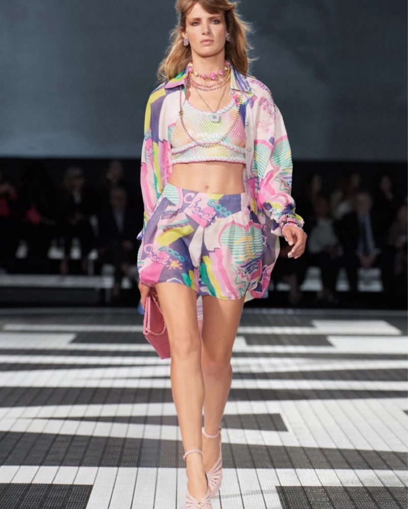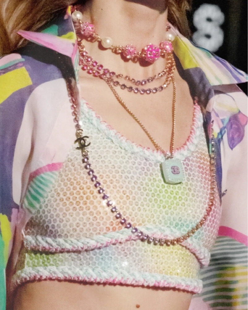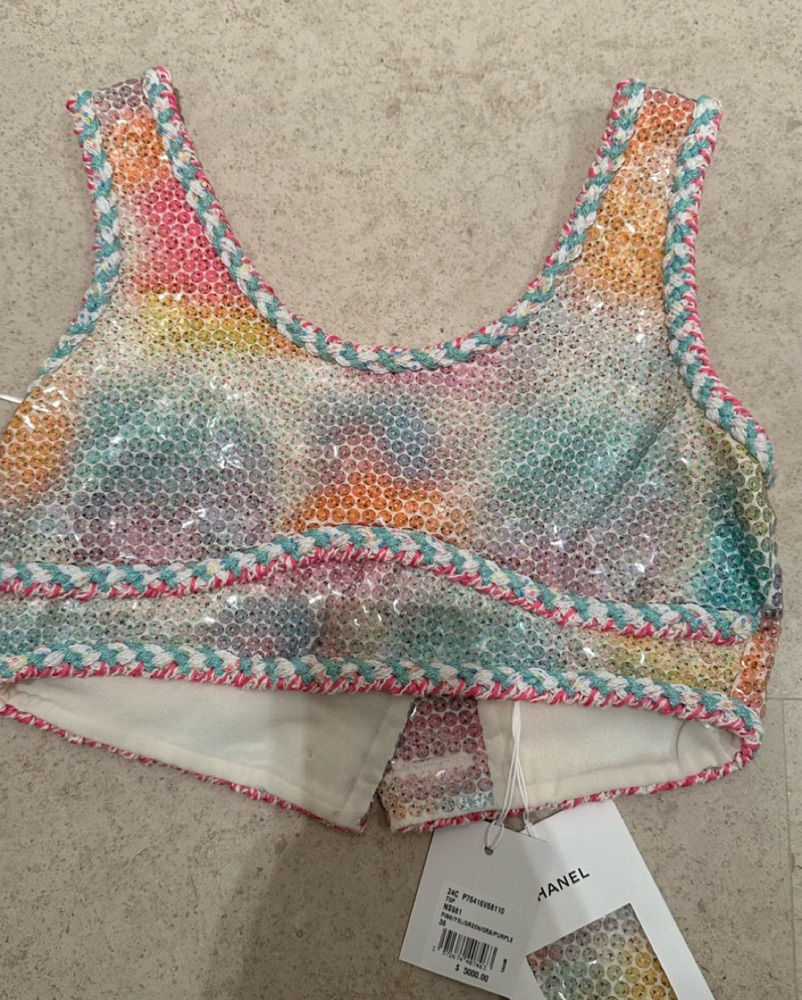 Chanel LA show. Multicolored sequin crop top. Sequins all says 'chanel'. Back buttons. FR36