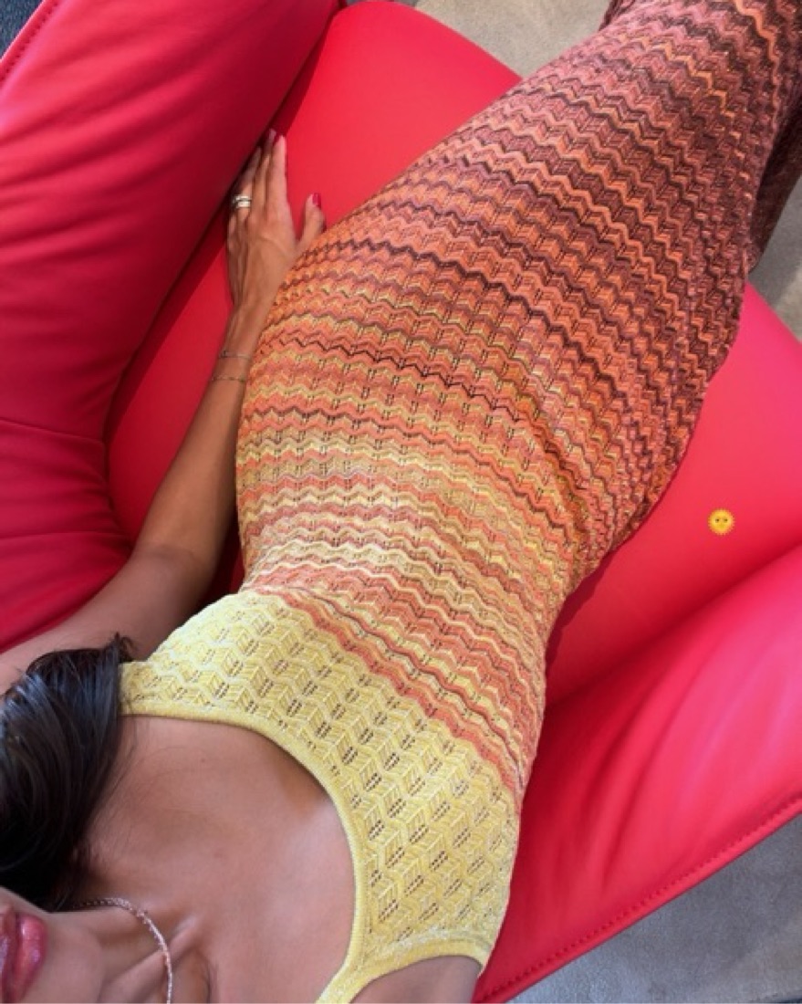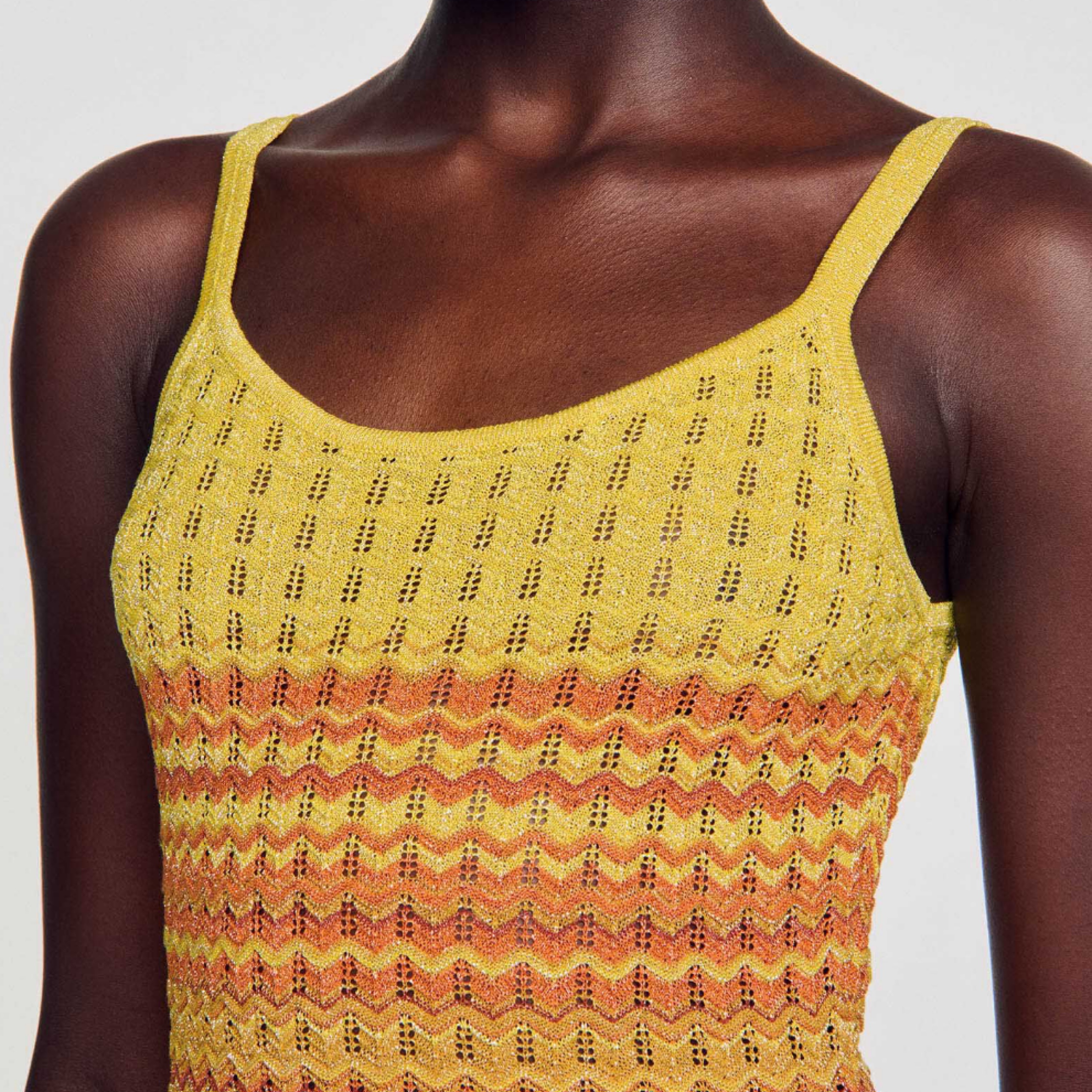 Maxi dress in gradient pointelle knit with zigzag pattern, spaghetti straps and scoop neckline at front and back. Stretchy material fits sizes S/M/L. Tags: Sandro, Missoni, vacation, dress