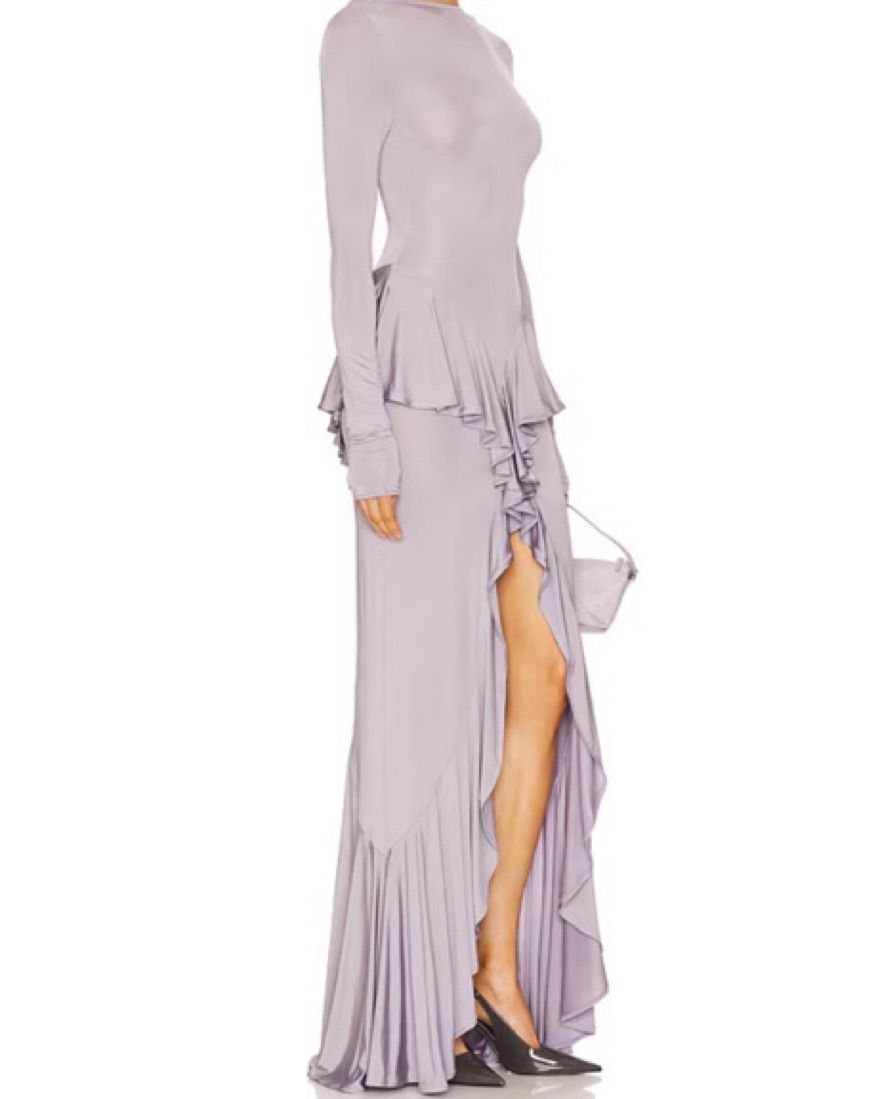 Purple/Lavender Pull-on styling Plunging V-neckline at back Jersey fabric with ruffle accent and front slit