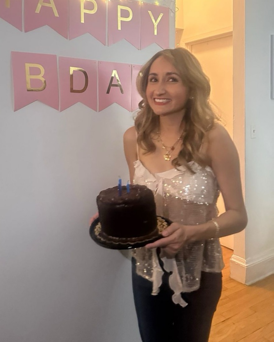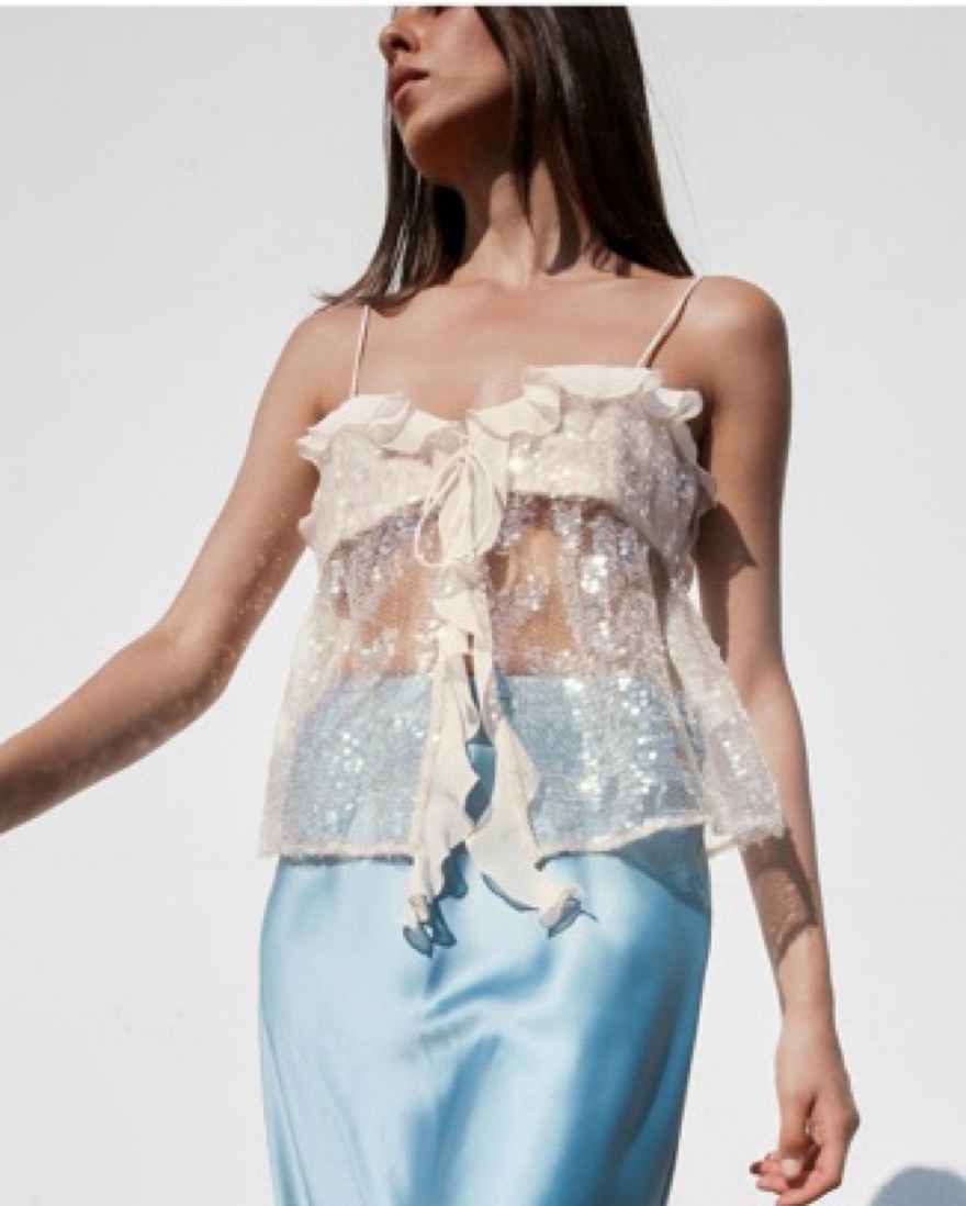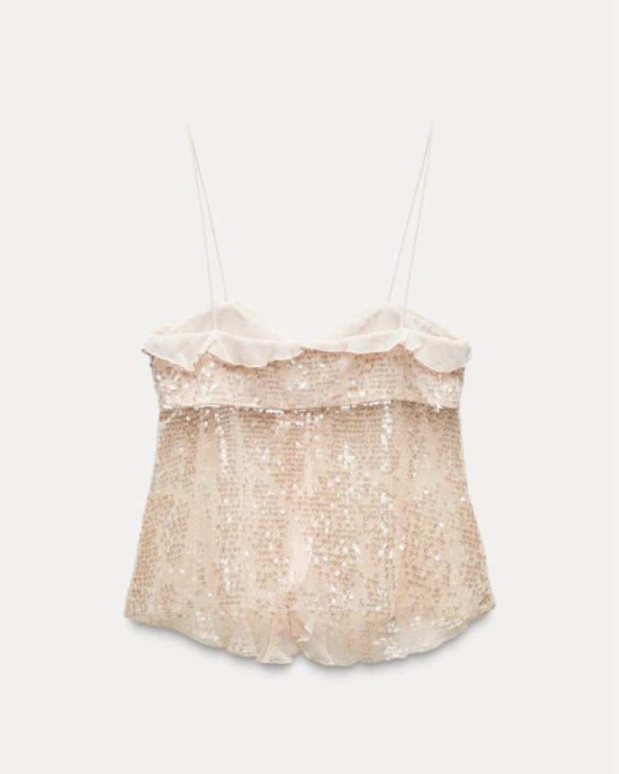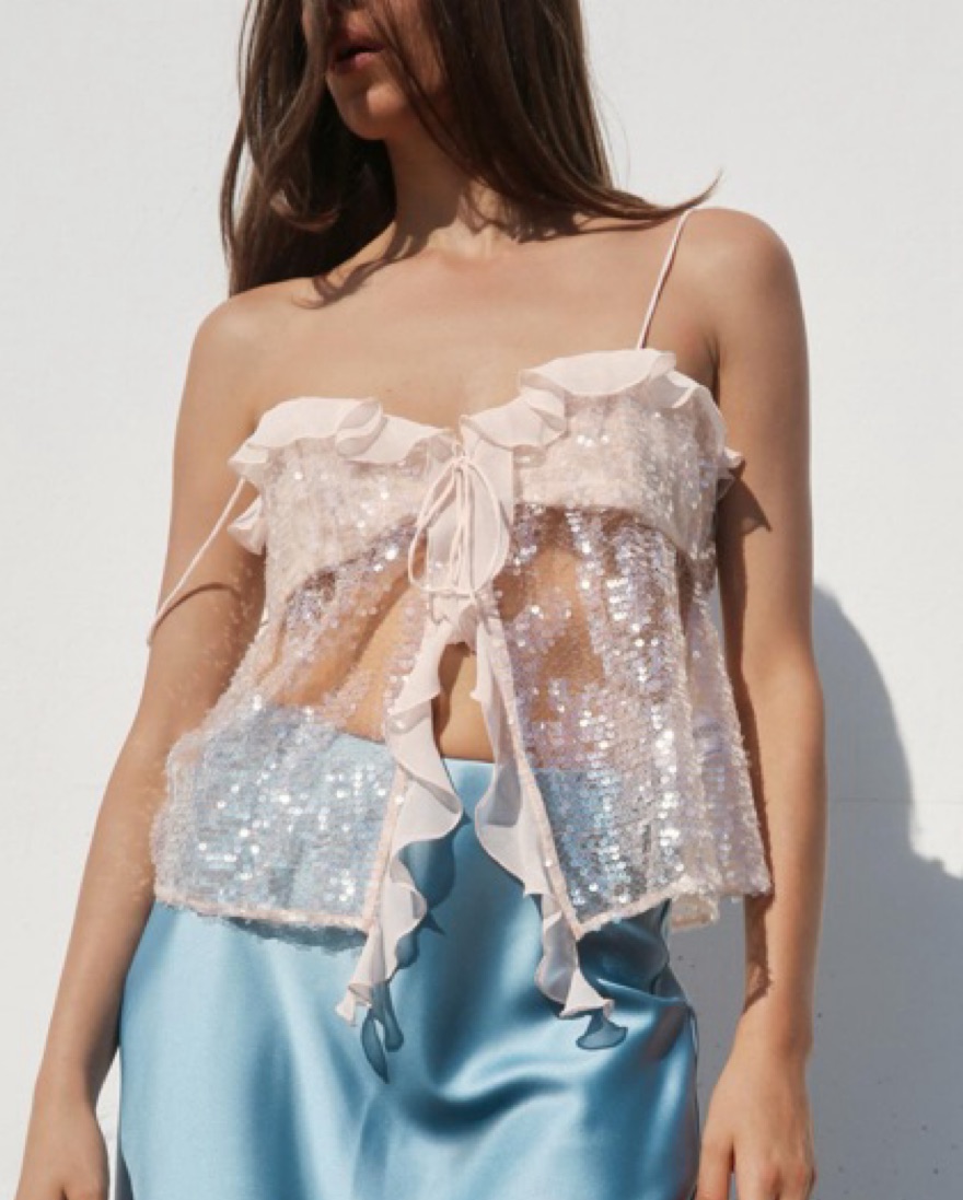 Mixed fabric top with sequins. Ruffled v-neckline and thin straps. Front slit at hem.