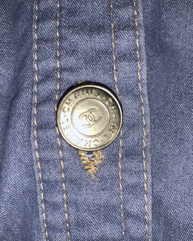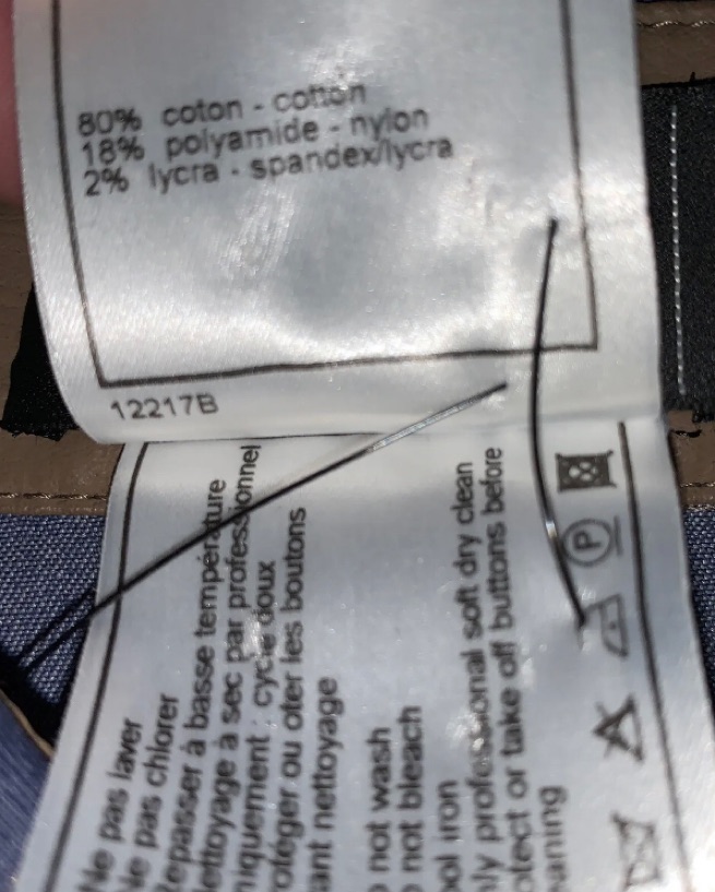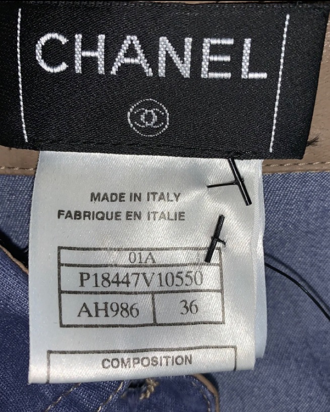 From Fall/Winter 2001 Collection. Chanel name tag at front left waist. Fabric content: 80% cotton, 18% polymide, 2% lycra.