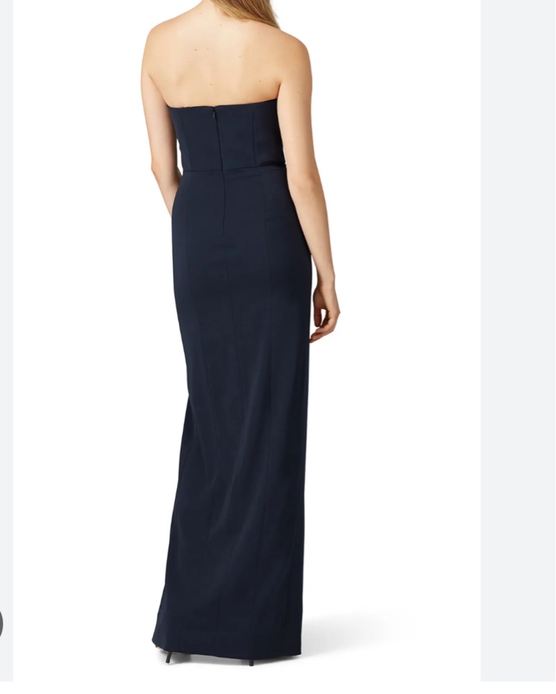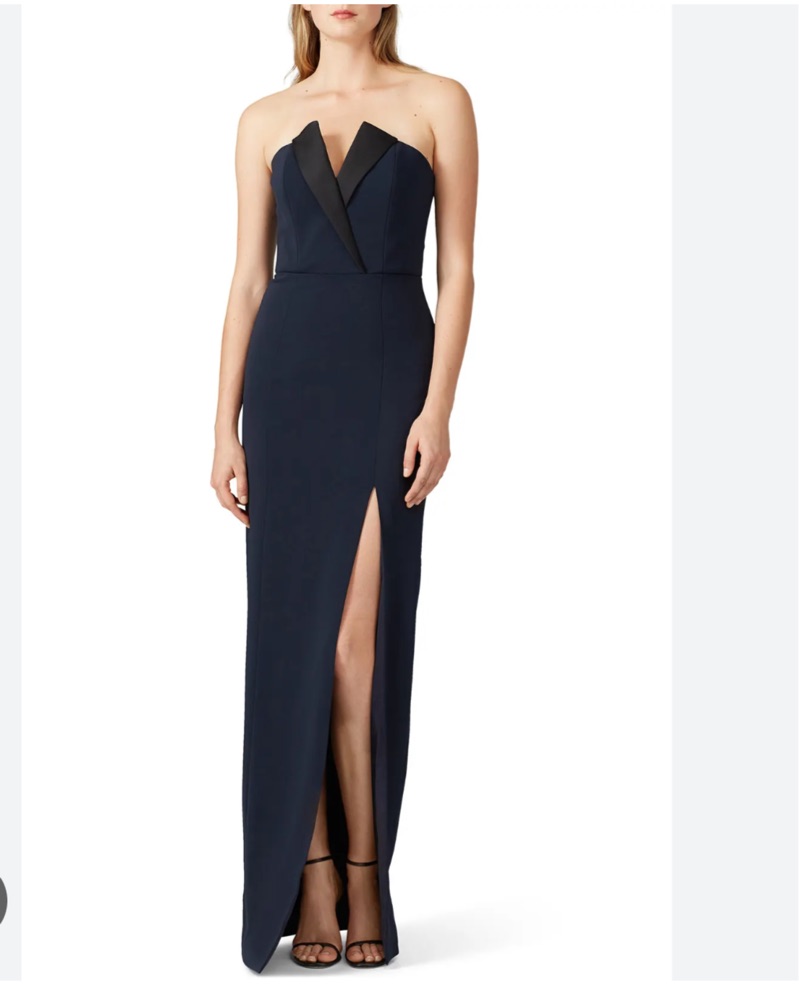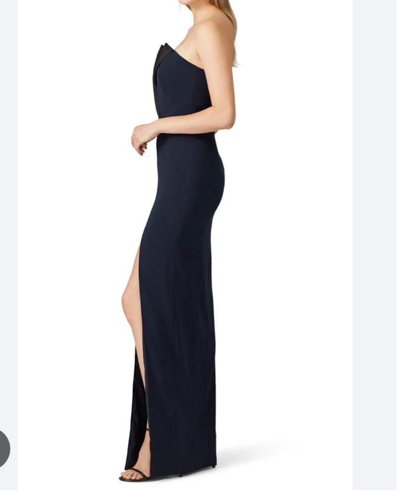 Jay Godfrey strapless navy gown with black tuxedo detail. Side slit. Small tear has been repaired on side slit from tearing up the seam.
