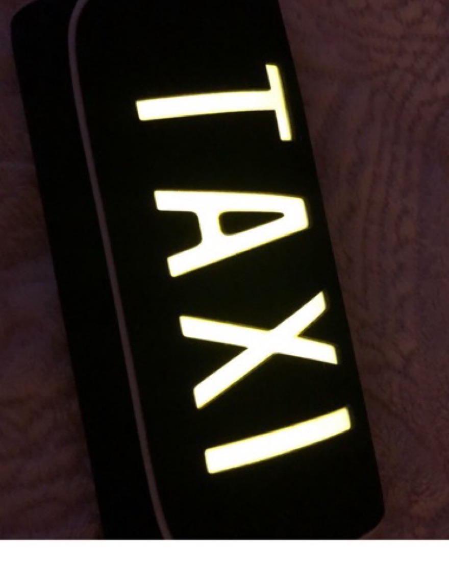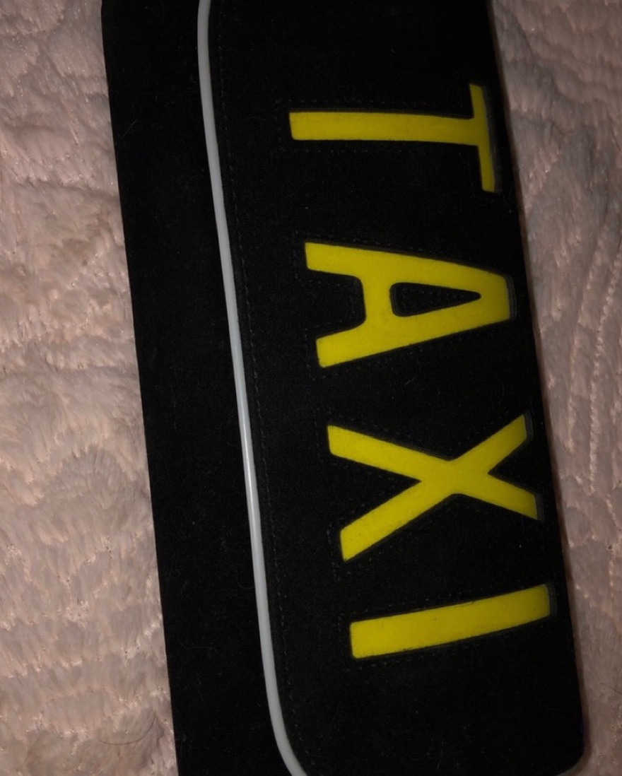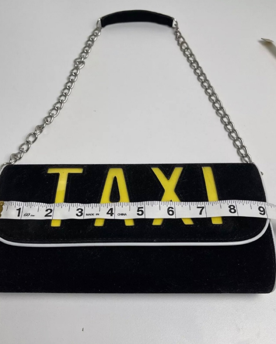 Taxi LIGHT UPpurse from New York fashion week! Enlight10 by Regine Basha Design. It runs on 2AA batteries (see photos for where they go) lights up vellow where the letters are. It's definitely a conversation piece! Can be worn as a clutch, or comes with removable chain that can be used. 10" long.