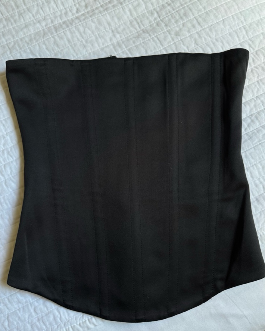 Silk strapless top is designed to sculpt and shape your body while cinching at the waist for an ultra hourglass silhouette. Curved hemline. Boning is in perfect condition. Pairs well with jeans and skirts! Back zipper. Size small. Originally $120. Gently worn condition
