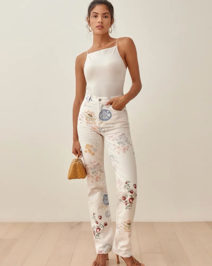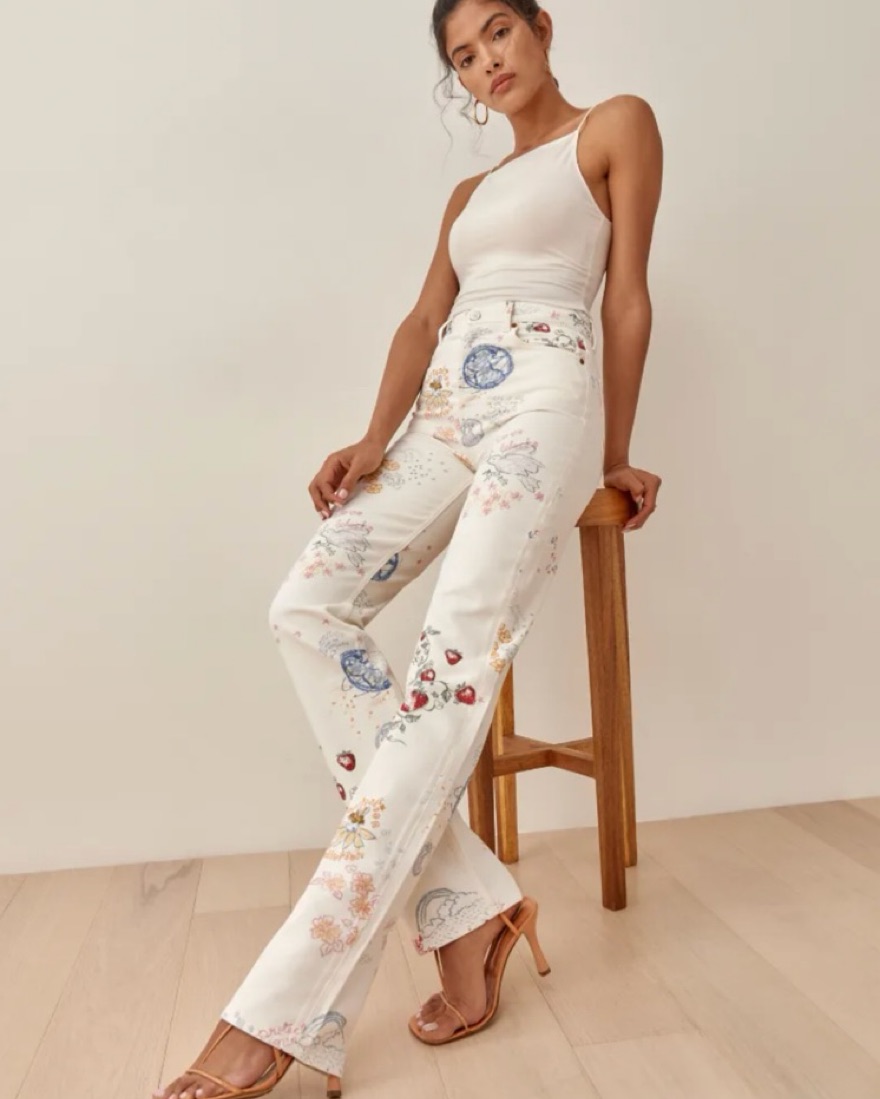 Sold Out and Discontinued Reformation Doodle Jeans. Organic denim blend. Displays an original doodle print honoring mother earth:) They are so flattering on the waist and butt! Most complimented jeans! Dry Clean only. Includes pockets, finished hem, button fly + loops!