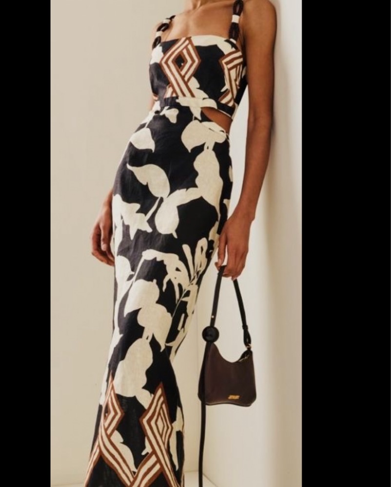 This stunning maxi dress features a bold floral print and modern geometric accents. Perfect for a summer wedding or special occasion.