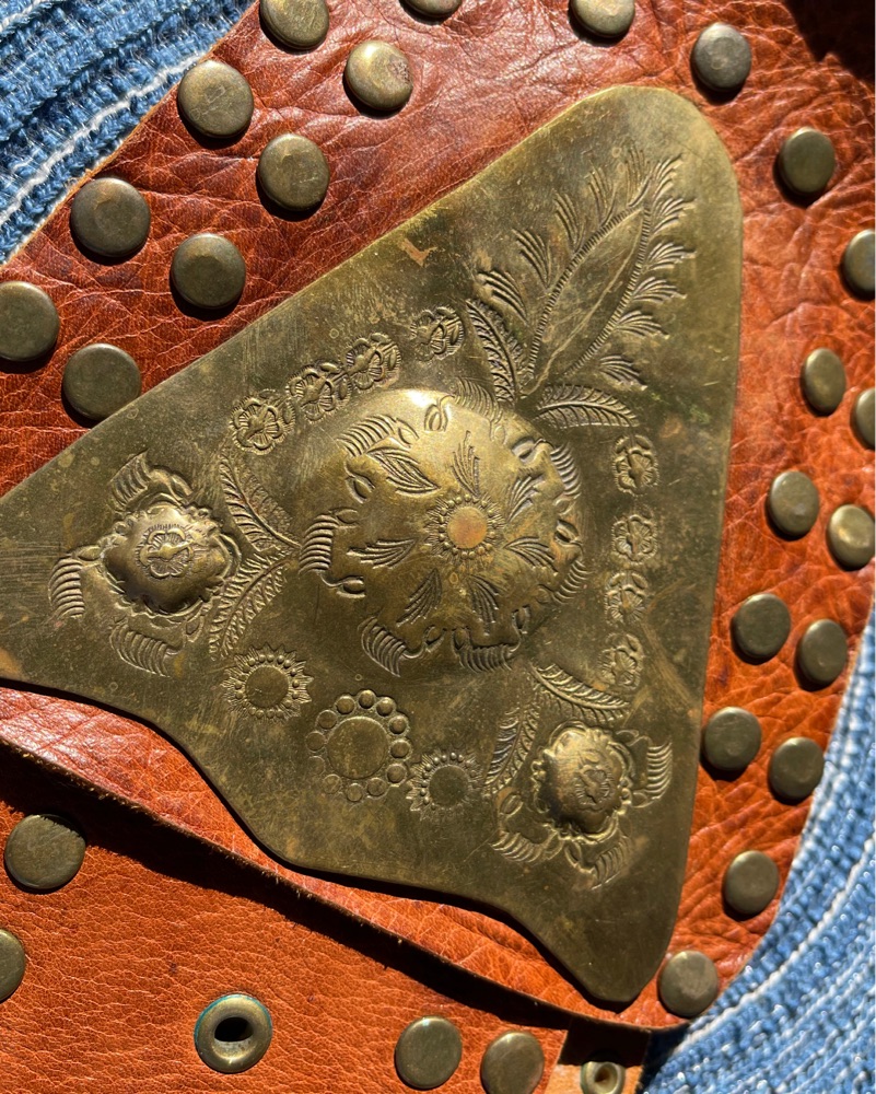 This statement leather belt with its intricate brass stud detailing adds a touch of edgy sophistication to any outfit. Pair it with your favorite jeans and a simple tee for a casual yet chic look.