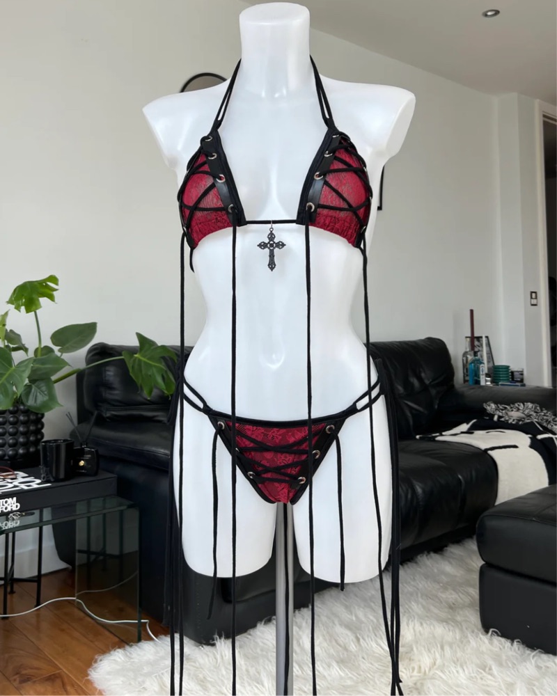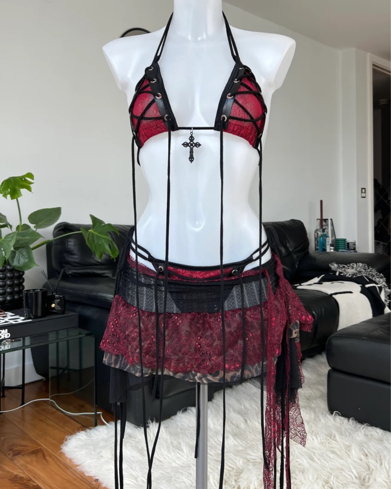 This handmade set is perffff for any rave or festival! SO hot with the lace and leopard detail on the skirt and leather lining on the bikini set 🥵