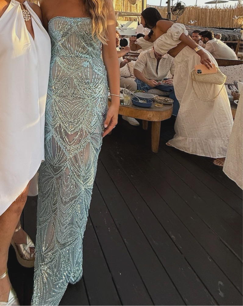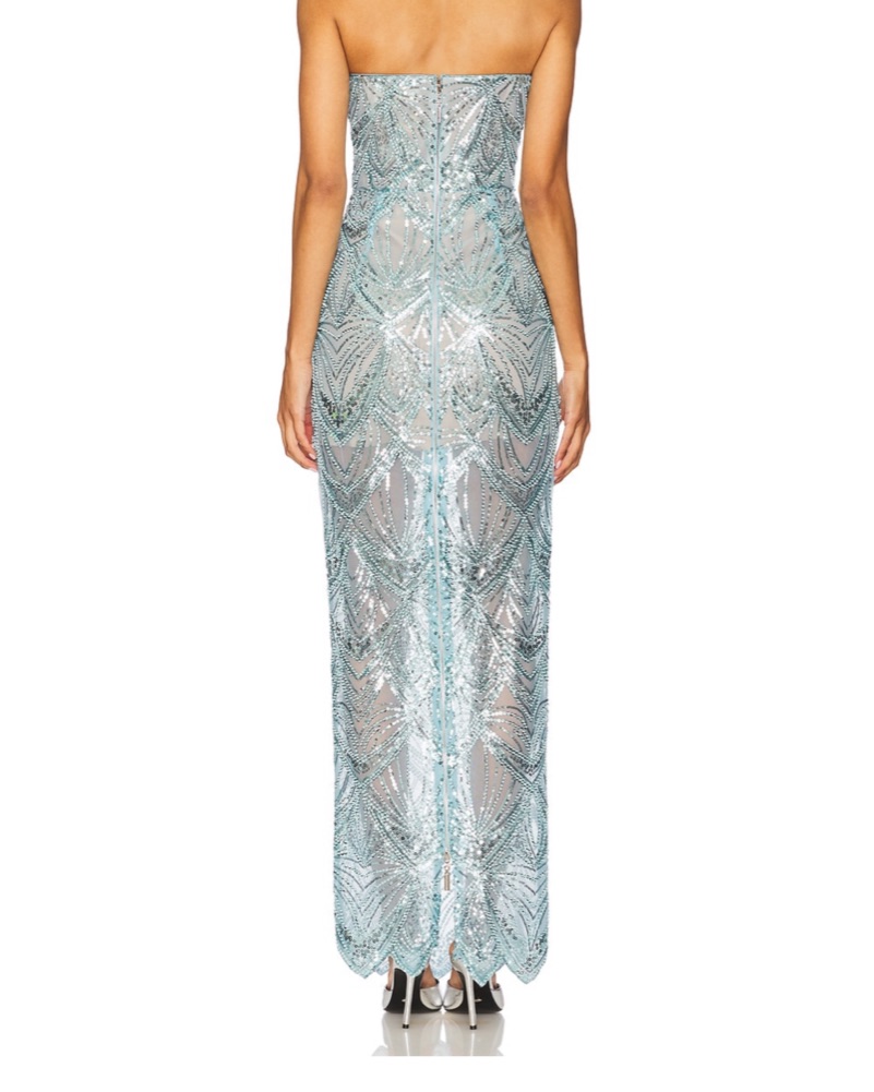 Such a stunning dress in perfect condition! No alterations made. Powder blue color in size S. Lined until the mid-thigh and then sheer throughout