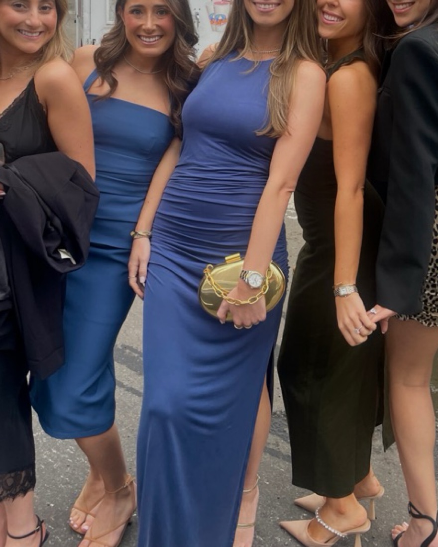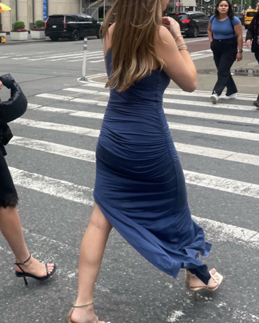 Blue long ruched dress. Has a slit. Can be dressed up for a formal event or dressed down for a beach dinner
