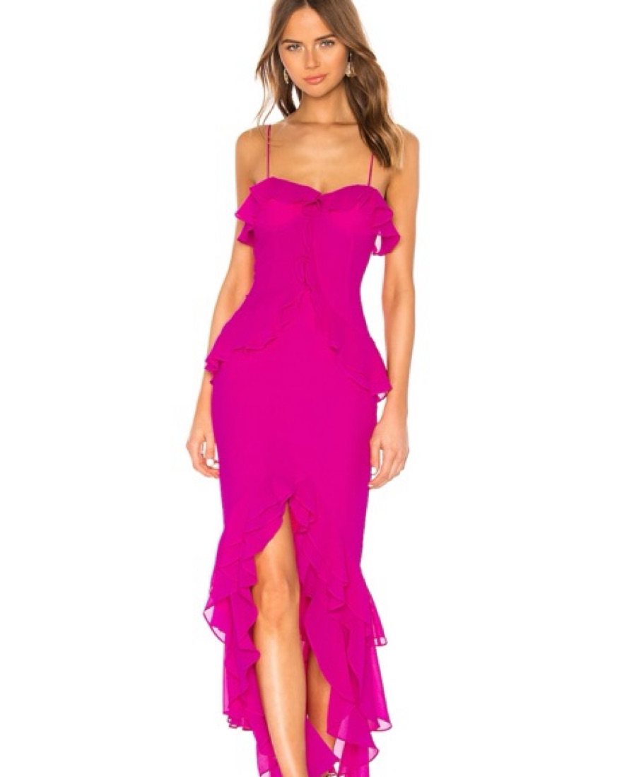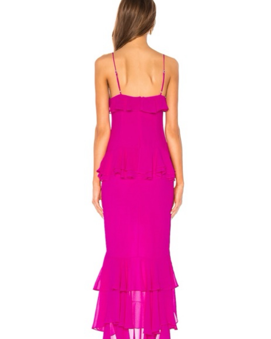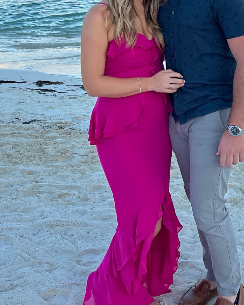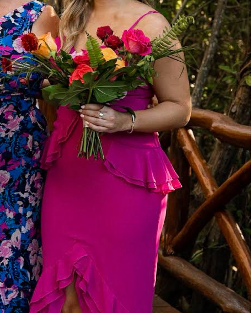Melissa gown in Magenta, size M. Worn once for my sisters wedding, so it was altered for length (I’m 5’3 and this was perfect with heels). No stains.