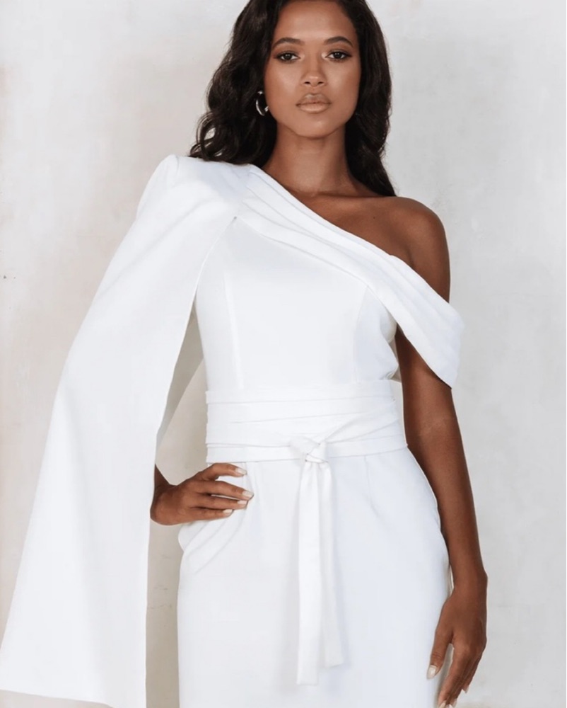 Turn heads in this sleek, structured one-shoulder white mini dress, designed for modern elegance. Featuring an asymmetric neckline with pleated detailing, a dramatic draped overlay sleeve, and a flattering belted waist, this silhouette effortlessly highlights your curves.