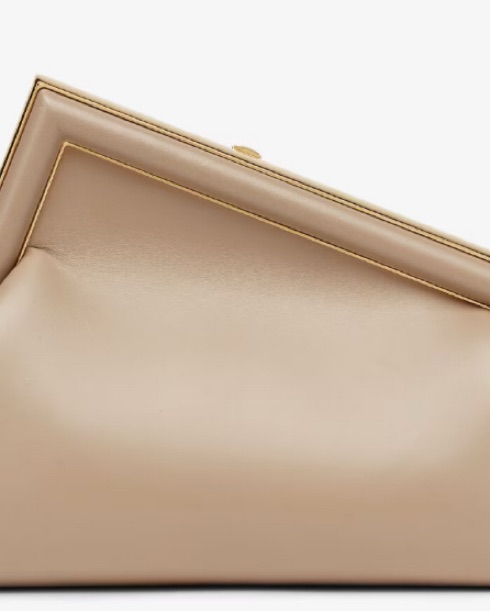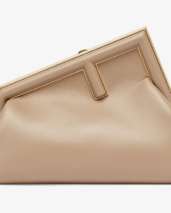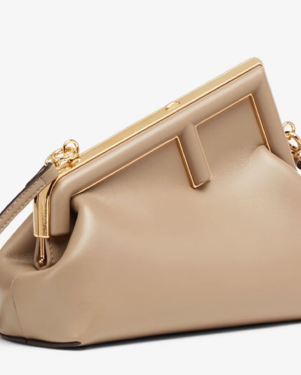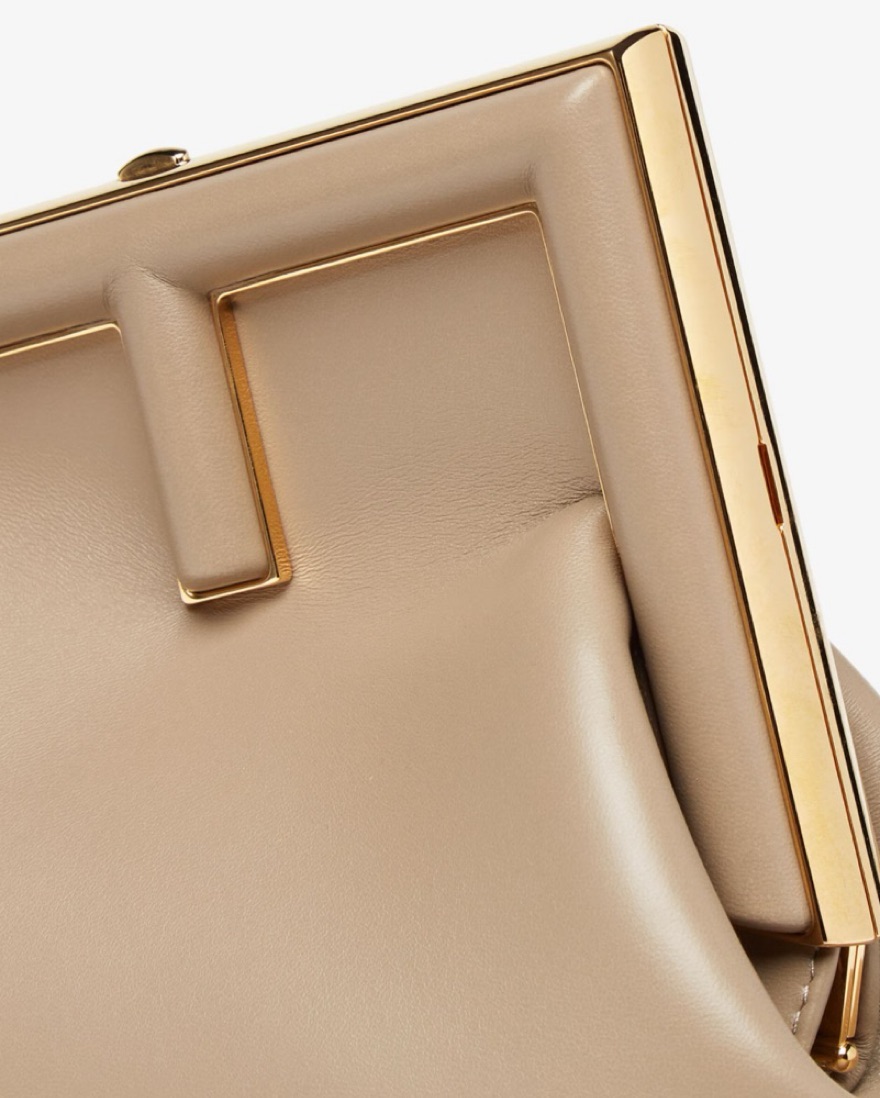 Small Fendi First bag made of soft, dove gray nappa leather, with oversized metal F clasp bound in tone on tone nappa leather.