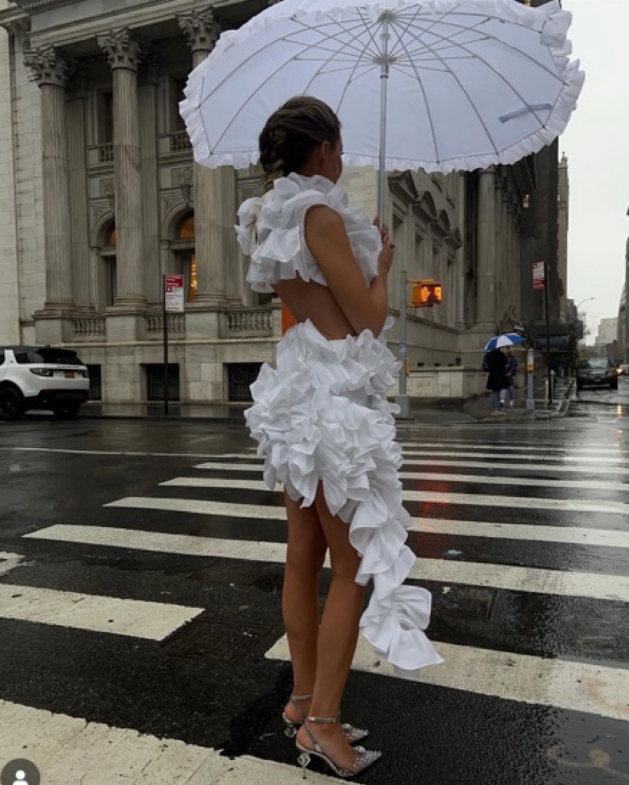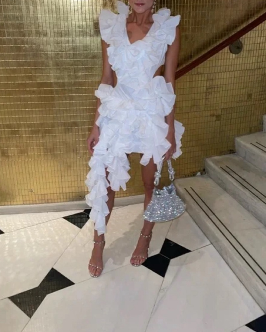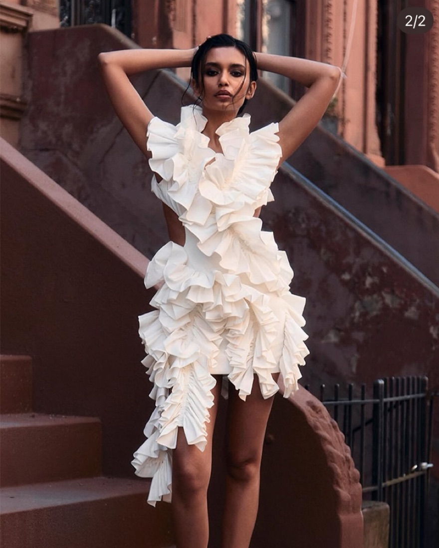 Our iconic ruffle dress, meticulously designed and hand-draped by our Creative Director, Christian Juul Nielsen himself. The dress features cascading ruffles with a mini skirt and a flattering open back. This updated version is constructed with stretch taffeta that hugs the body, providing a slimmin