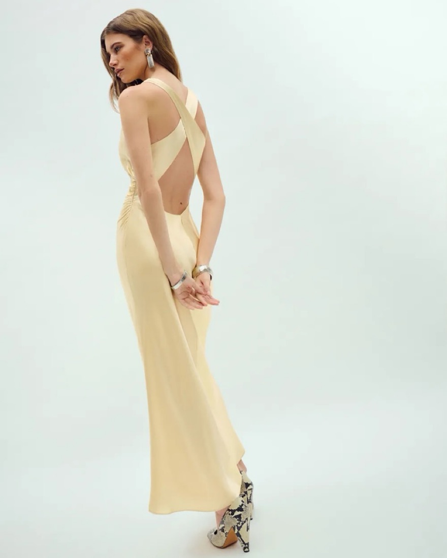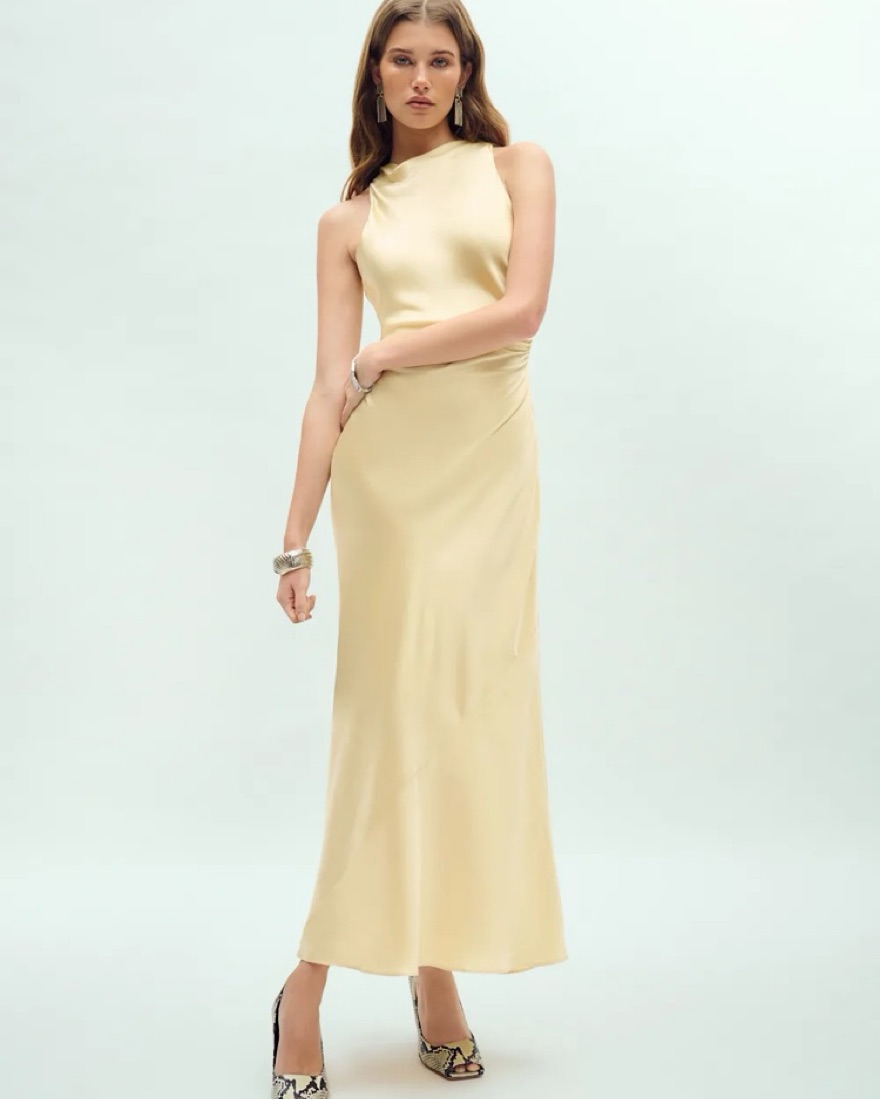 100% silk Reformation gown. This stunning silk maxi dress is perfect for a formal event or special occasion. The halter neckline, side ruching, open back and sleek silhouette create a chic, sophisticated look.