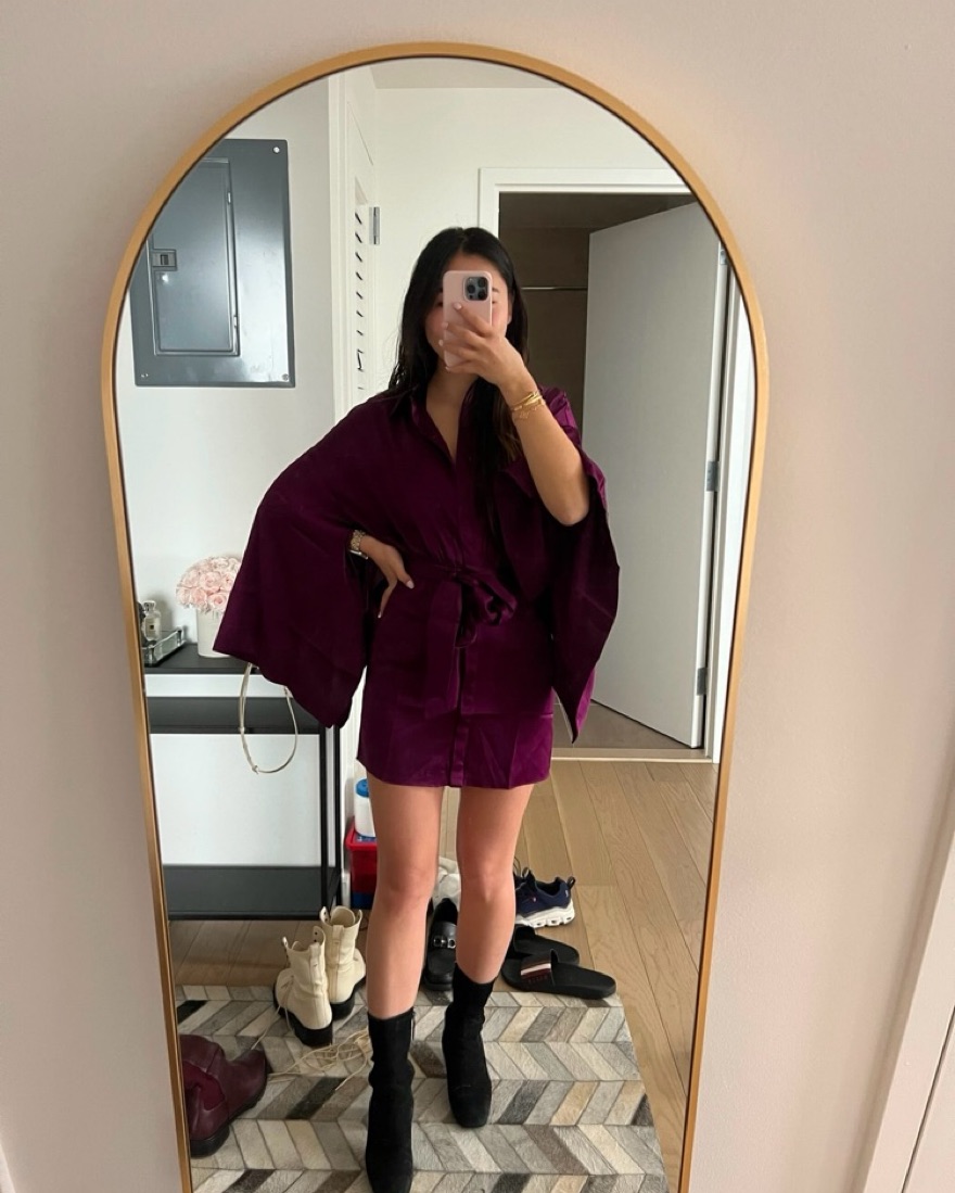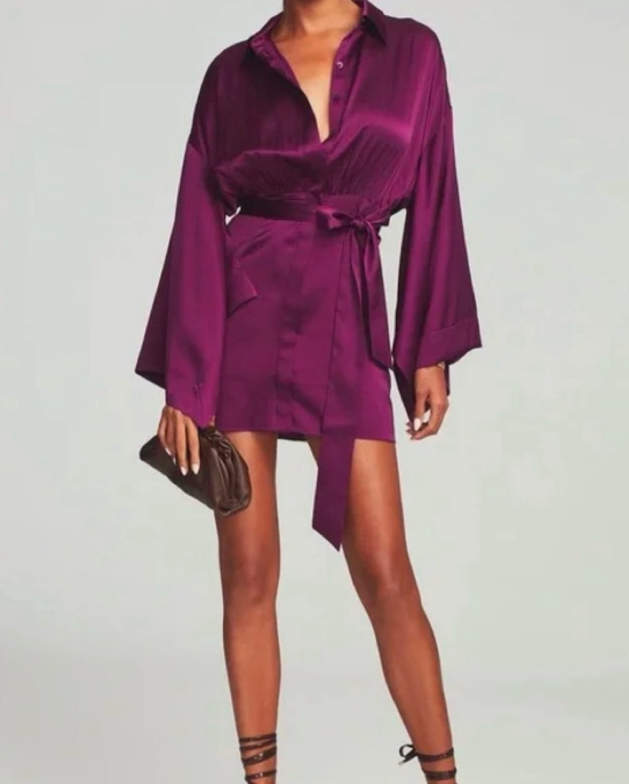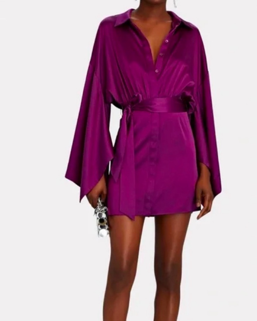 This stunning silky purple wrap dress with dramatic sleeves is perfect for a night out or special occasion. Tags: retrofete, purple, plum, mini dress, dramatic sleeves, big sleeves, shirt dress, silk dress