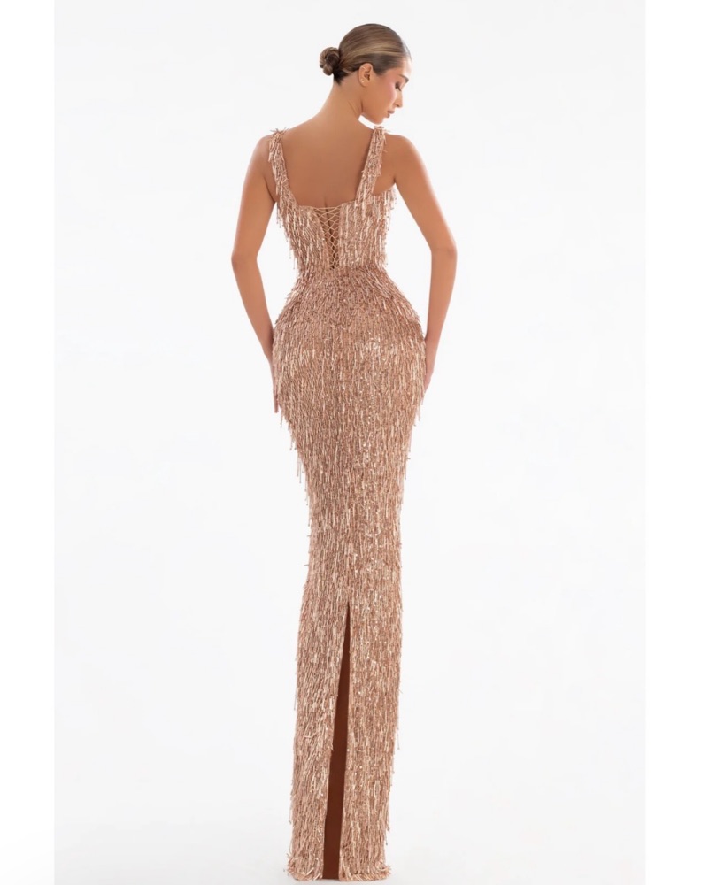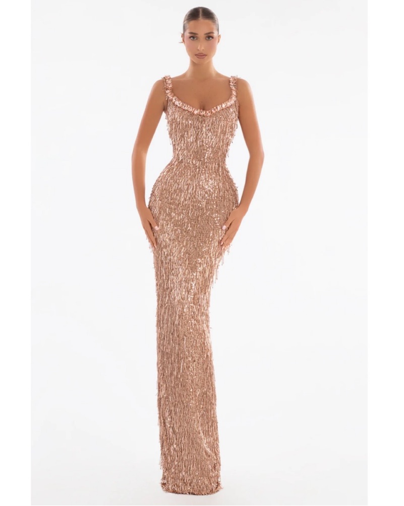 Stunning gown worn once for a wedding! In my pics it’s been altered to fit 5’3 with 2.5 in heels. Alterations are reversible, product photos show original length (model is 5’7 and wearing heels). Reversible alterations may be allowed for rentals for an additional fee.