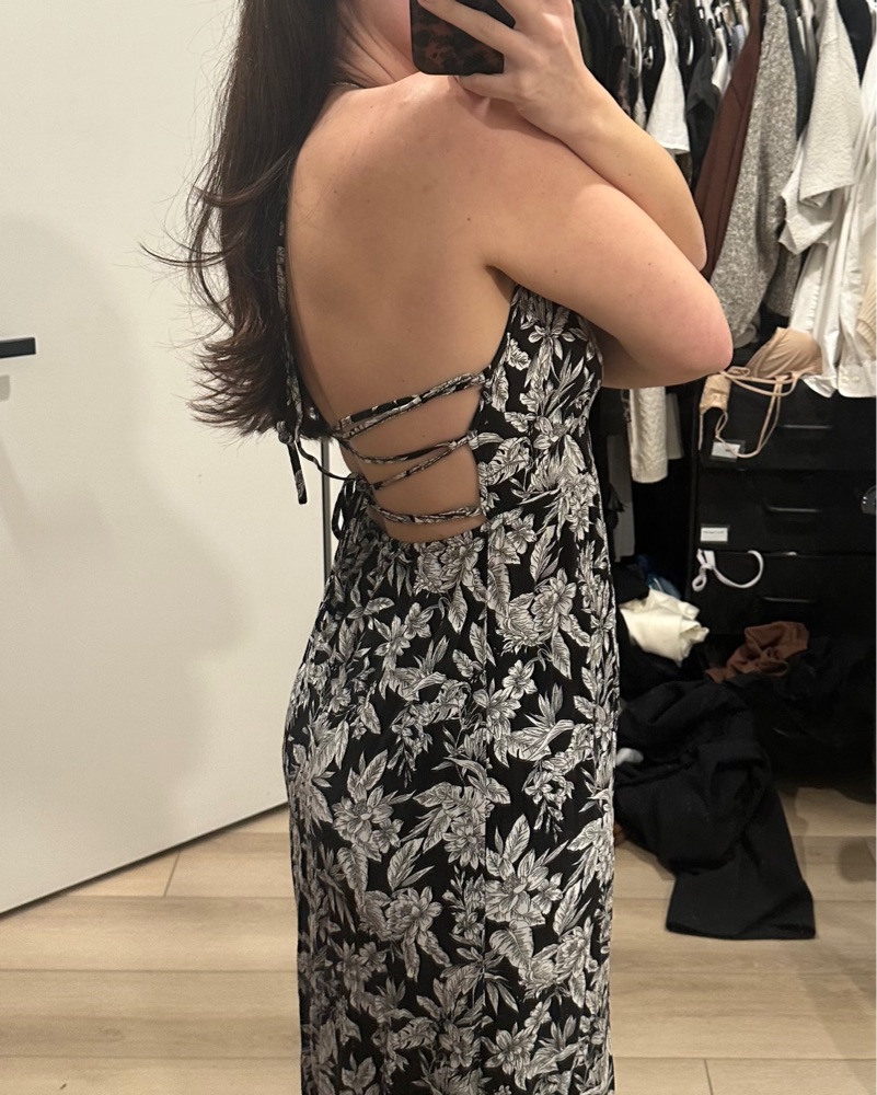 Ties at top of neck for a halter like style and then separate ties for an open back. Can tie however you want it to fit :) I’m 5’4 and it just barely hits the floor when I’m barefoot.