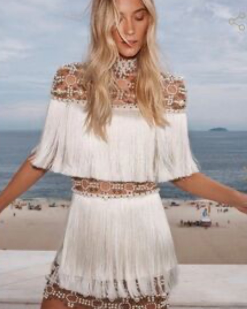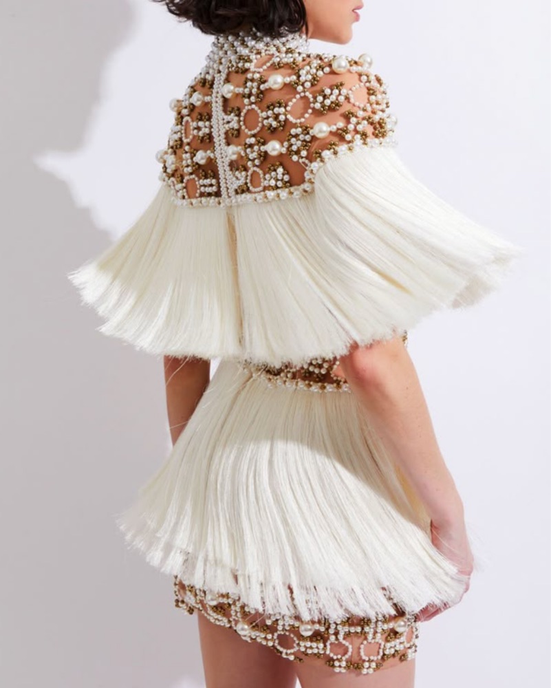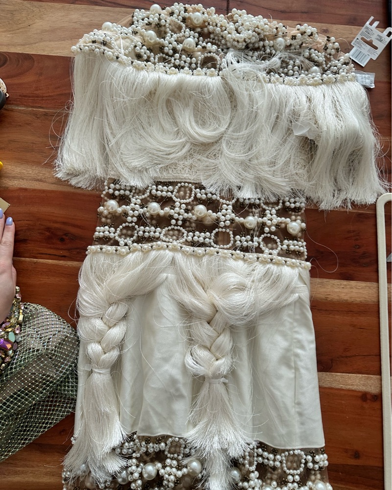 Runs extremely small! This is for a 00 even though the tag says 0. The shoulders are very tight and more for a photograph moment. It’s very beautiful. Brand new with tags. Fringe is braided to keep it from tangling until worn. SHIPPING for purchase only. RENTALS for local pickup or courier only