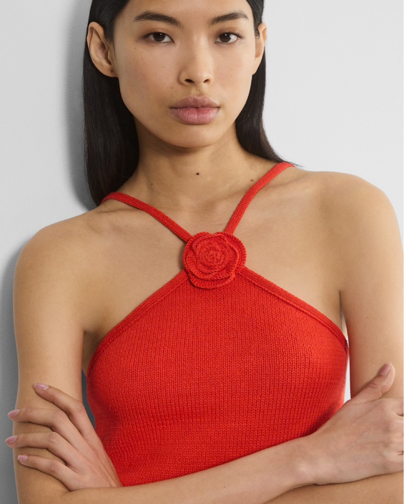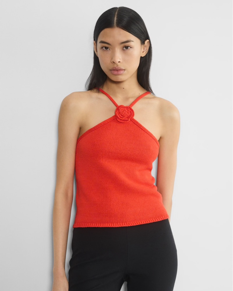 Aritzia runs large. This is a 2XS but fits like an XS. Not for a chest size larger than 32b. The color is poppy red so it is a reddish orange.