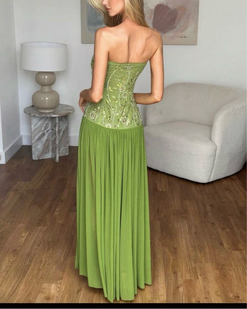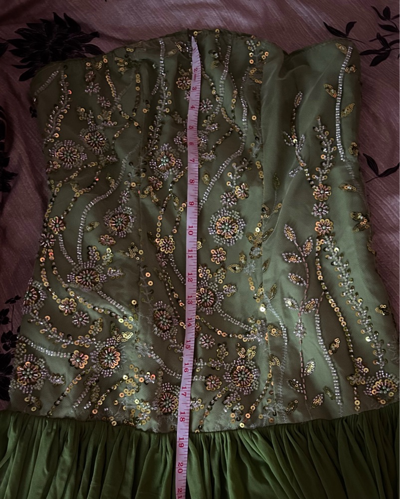 STUNNING Intricate Beaded Embellished Green Gown. Waist 25in VERY STRETCHY! Entire length 55in. Not too long- no train so it’ll work if petite or tall! Side Zip! Perfect for special occasions, Wedding Guests, Bridesmaid / MOH. Tagged Wong for exposure, missing original tags!