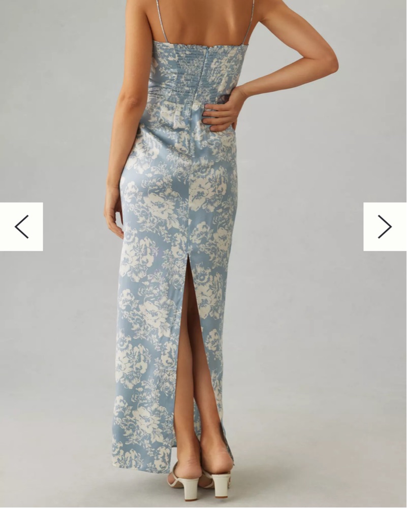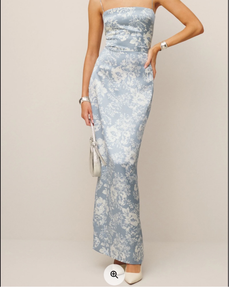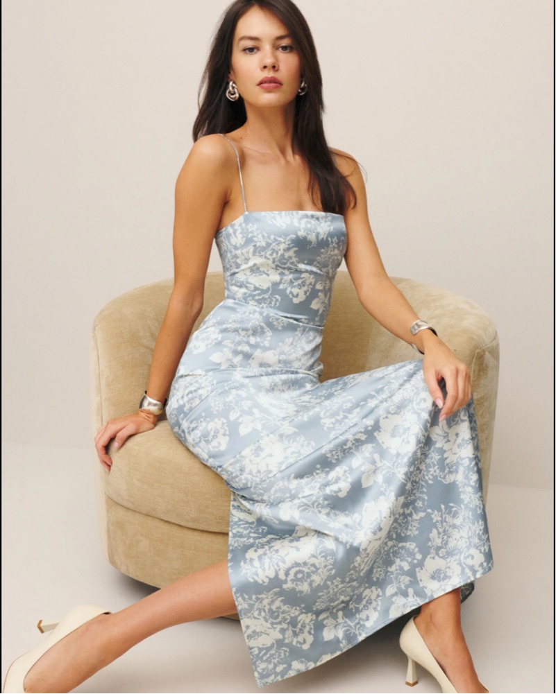 Reformation blue silk dress. The perfect bridesmaid, wedding guest, or special event dress!