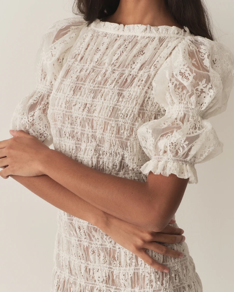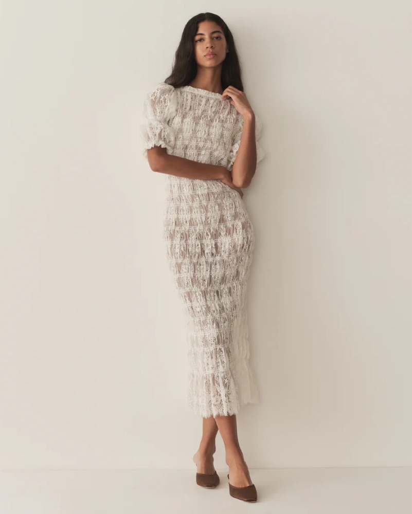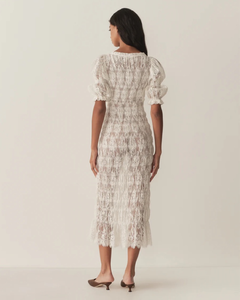 Reimagined in intricate chantilly-inspired lace, the Raquella Dress is an easy-wearing pullover style with a bateau neckline trimmed with a ruffle, elbow-length double-puffed sleeves, and allover elasticized smocking. A fitted silhouette gives way to an ankle-grazing skirt with a scallop lace hem.