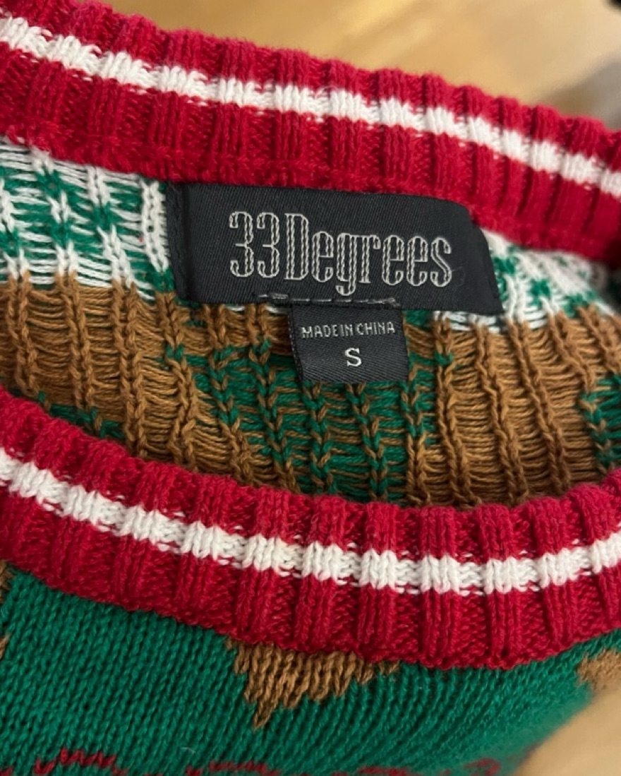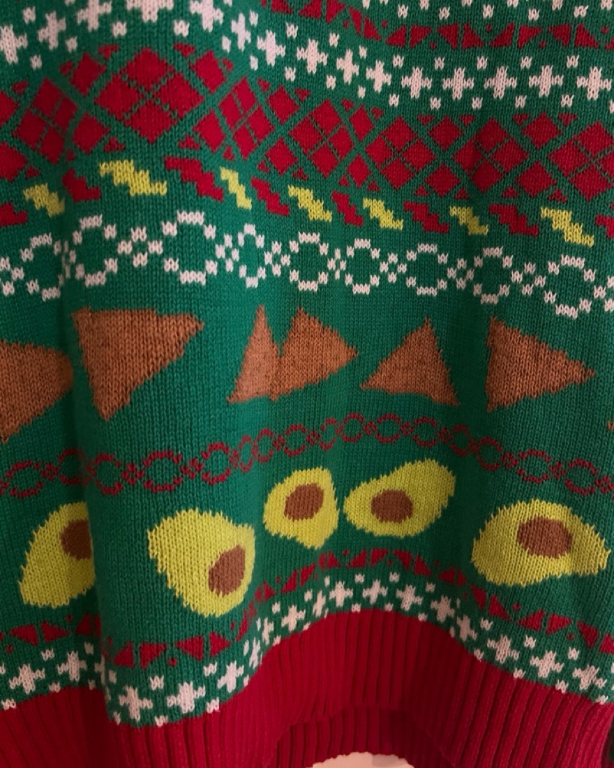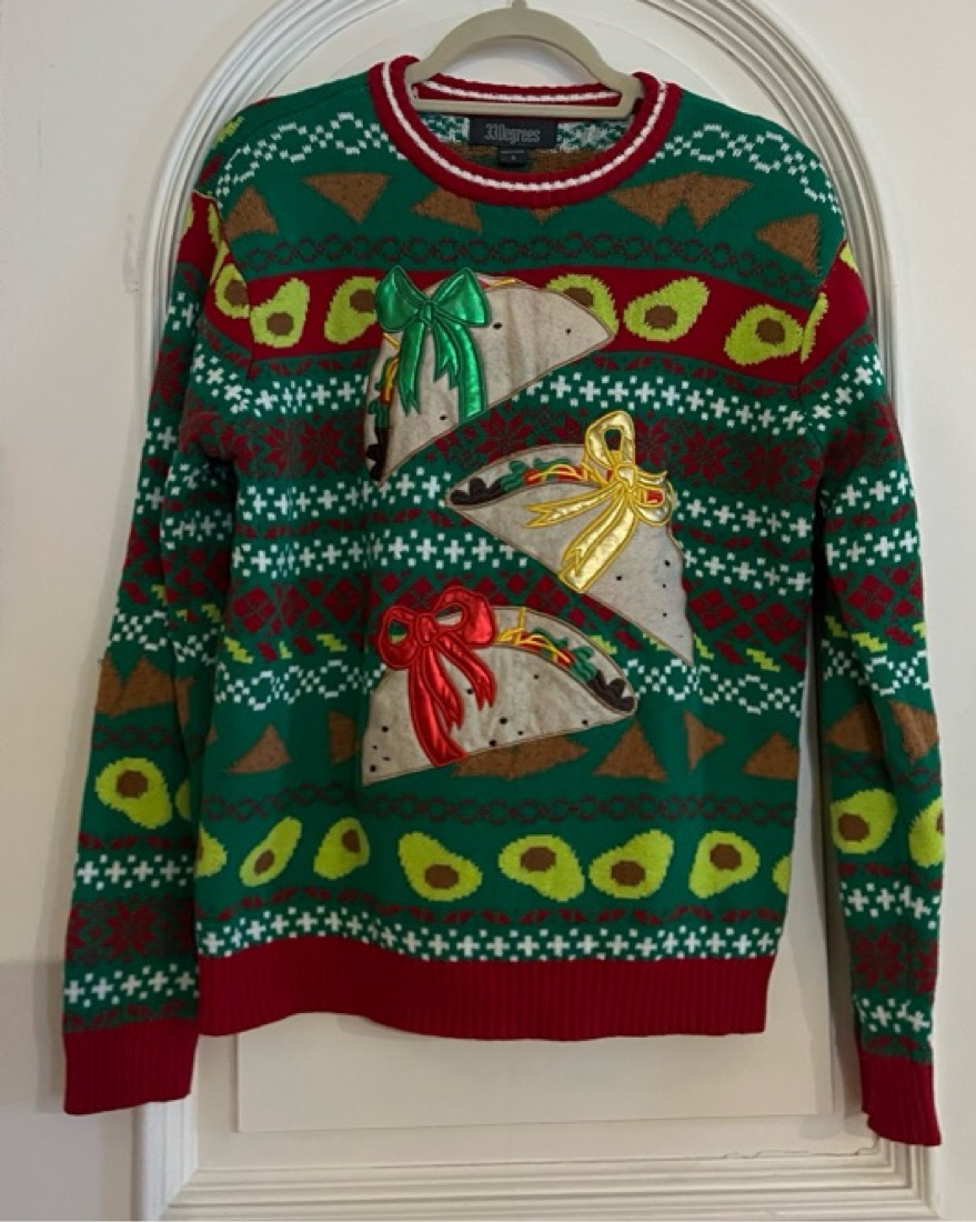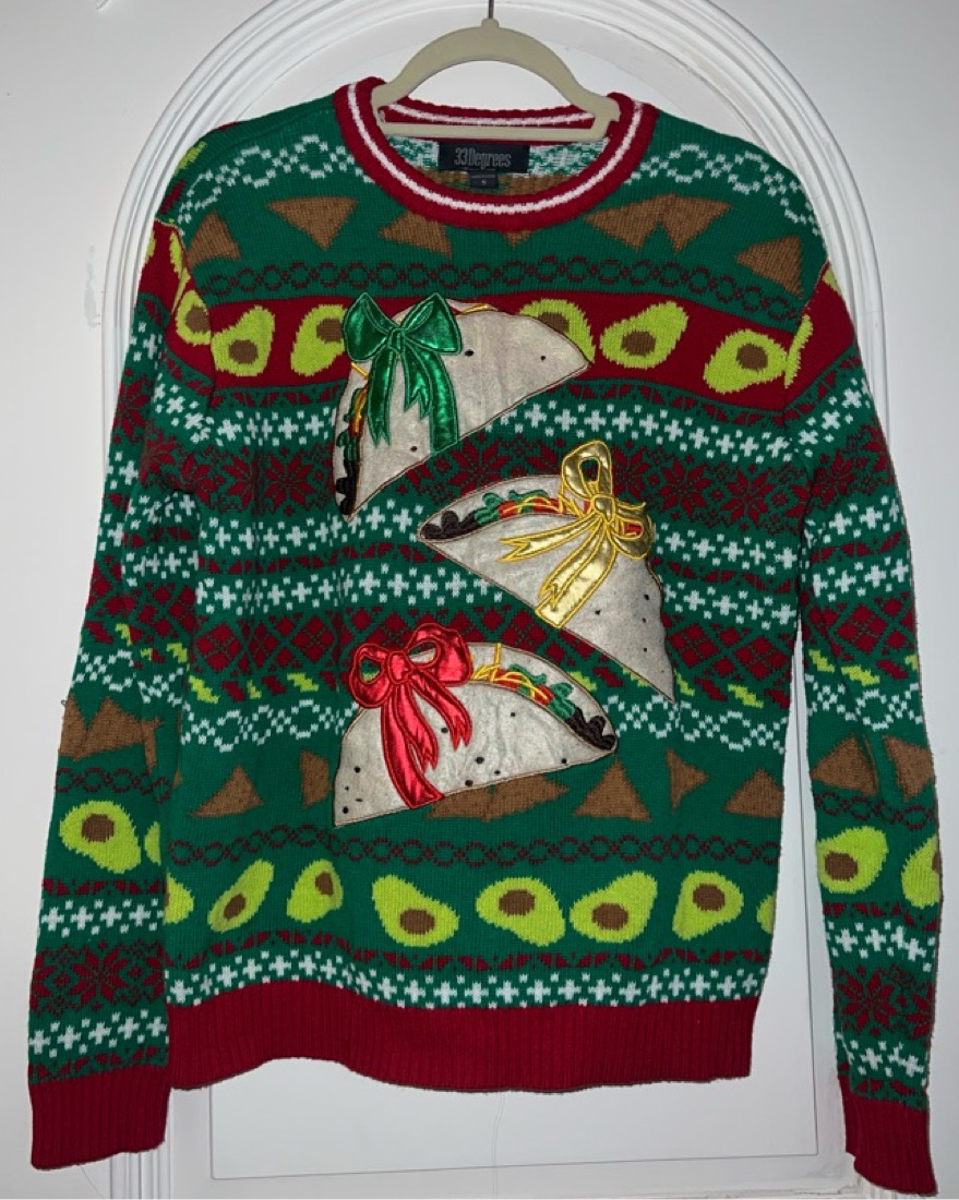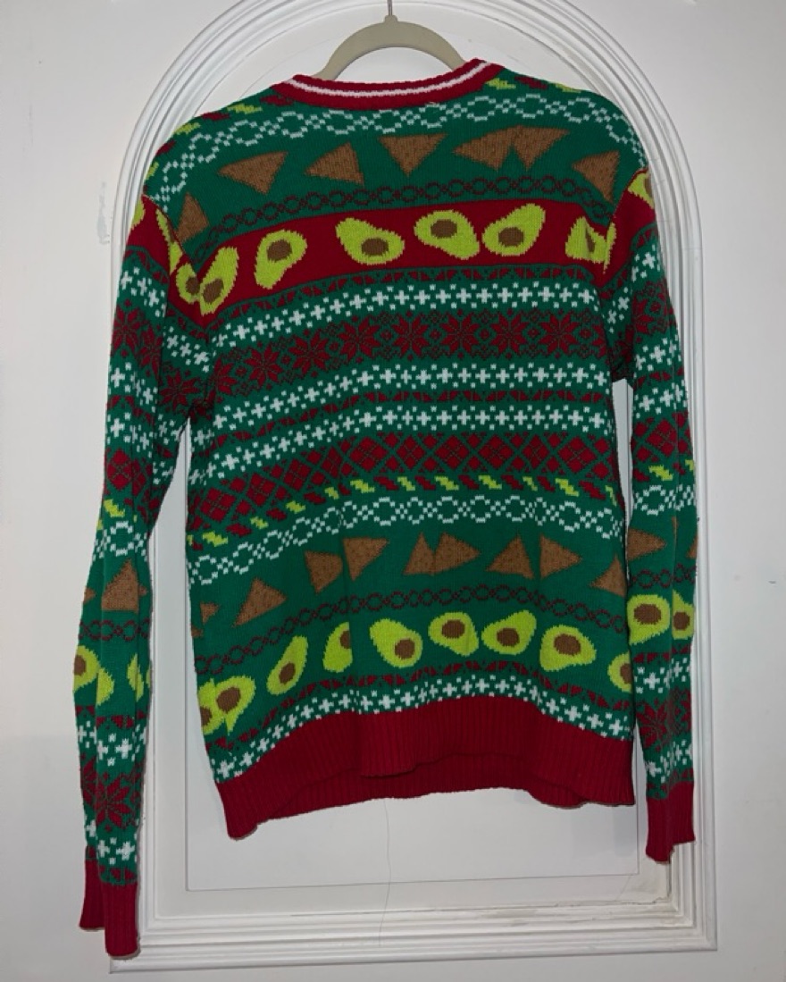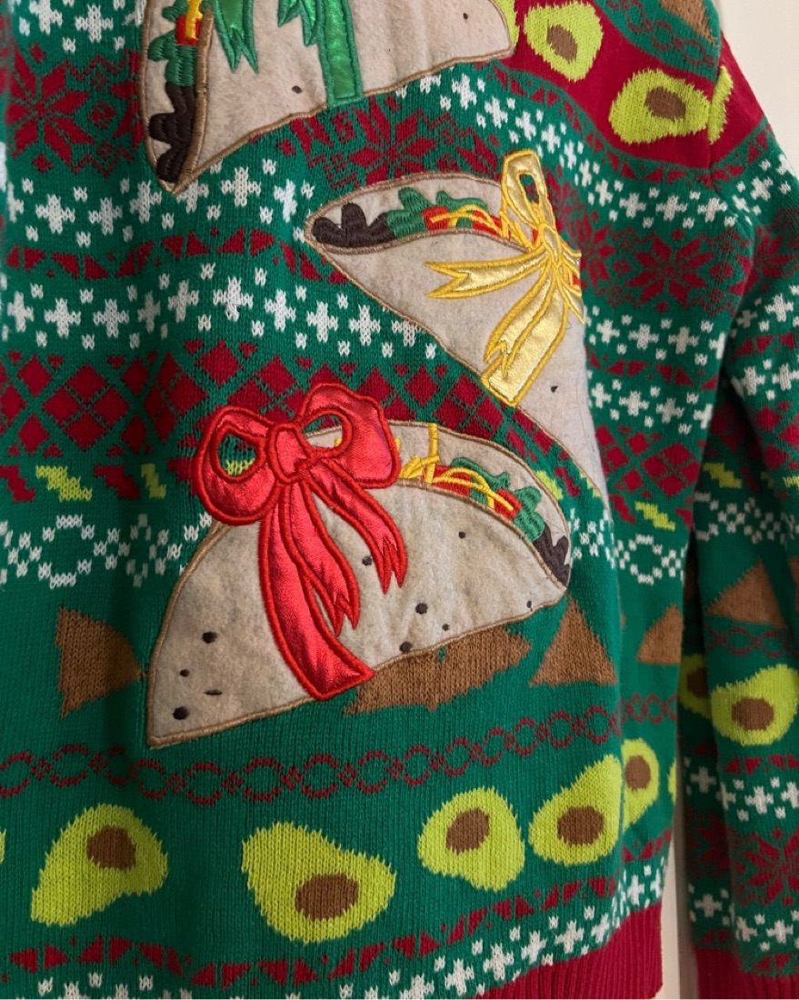 Super cute and fun Ugly Sweater by 33 Degrees. Perfect fun holiday Christmas sweater with taco avocado and tortilla chip print. Size S