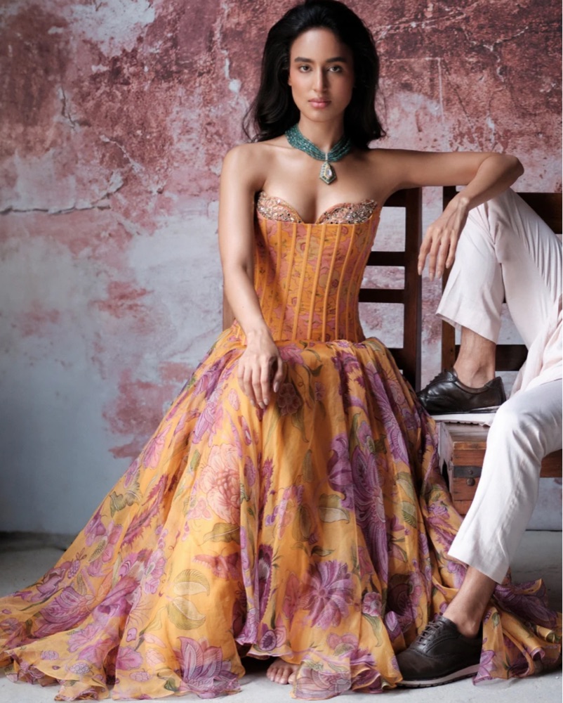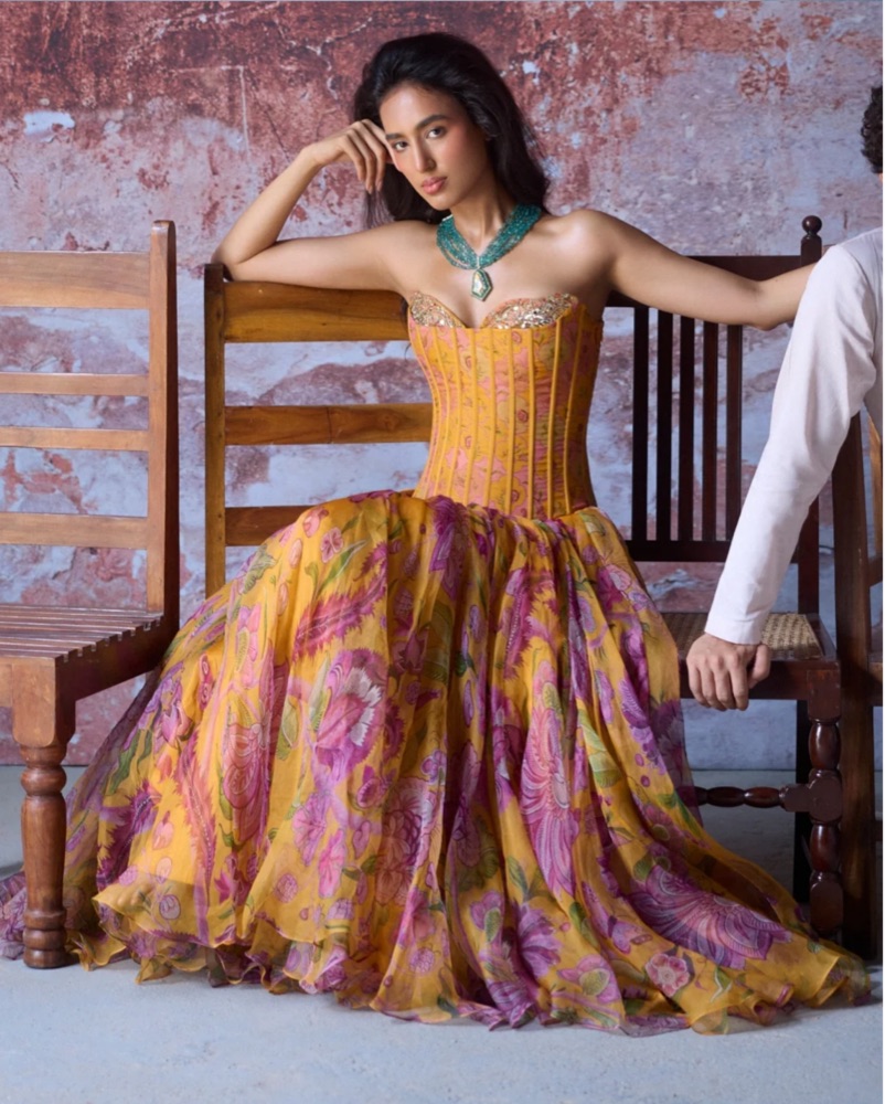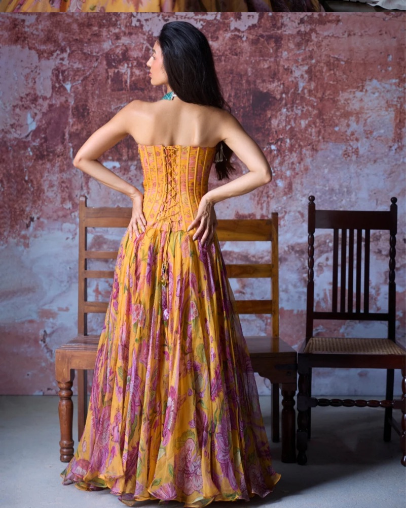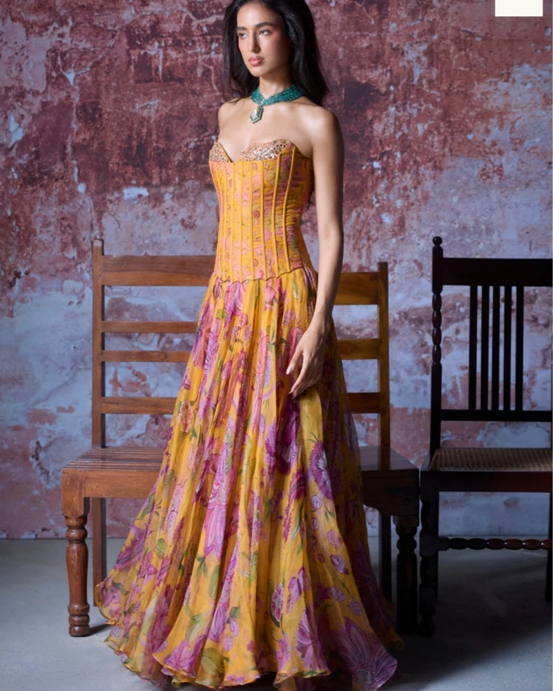 This stunning desi gown features a vibrant floral print and a structured corset bodice, perfect for a formal event or special occasion. Purchased from shop Kynah. Worn once to a wedding