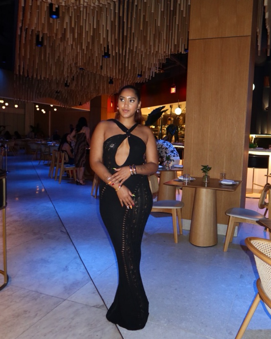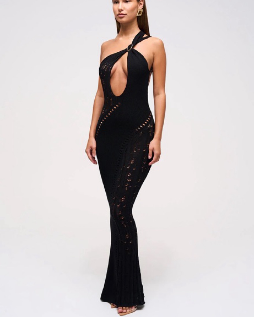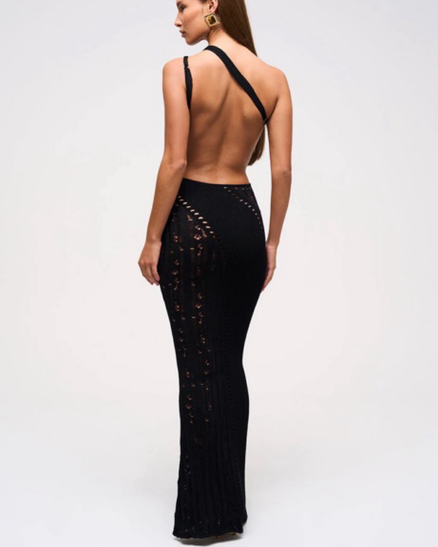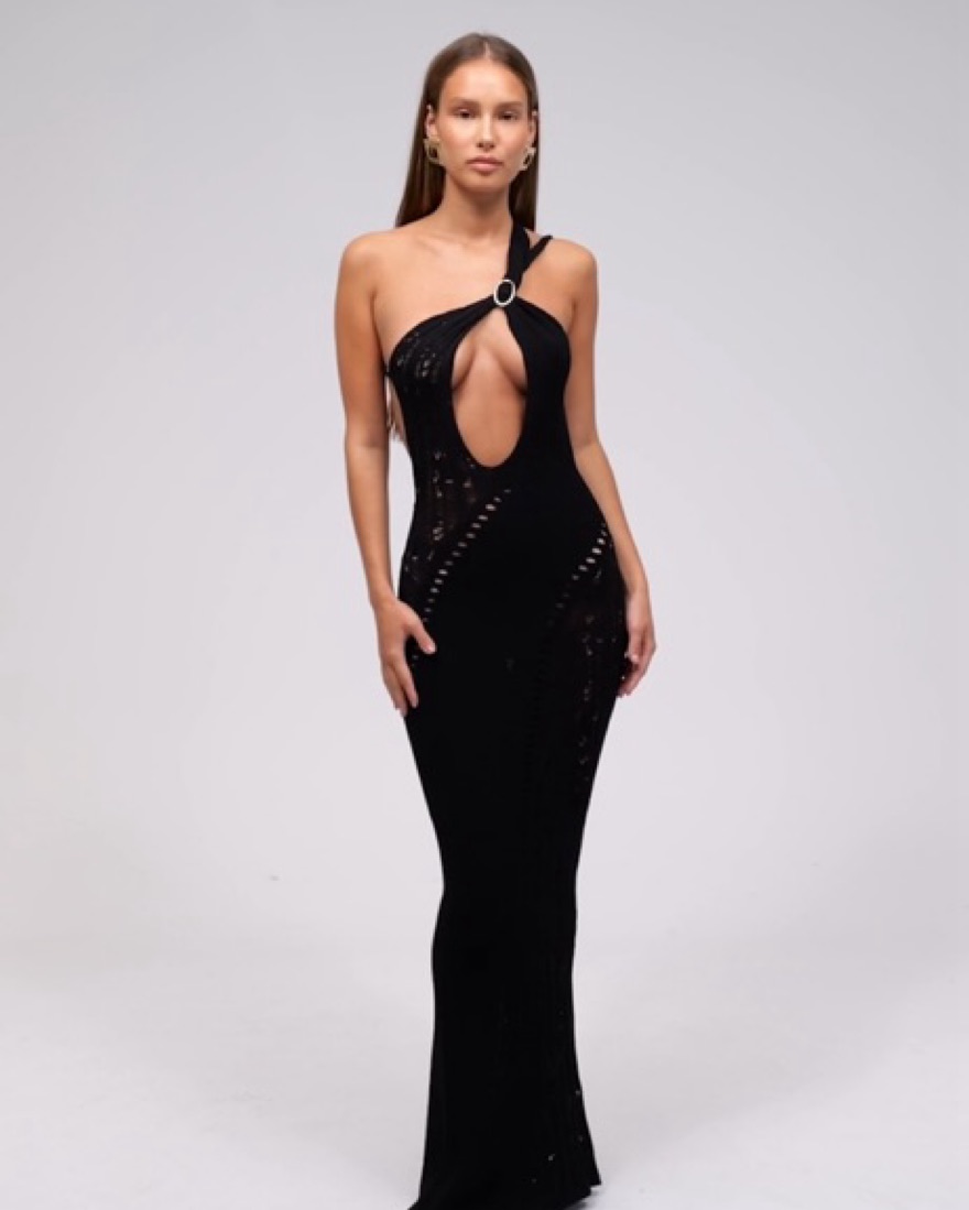 Maxi length - Laddered knit details - Sheer fabric - Bodycon fit - Keyhole detail on the bust - Asymmetric neckline -One shoulder sleeve - Self-fabric back ties