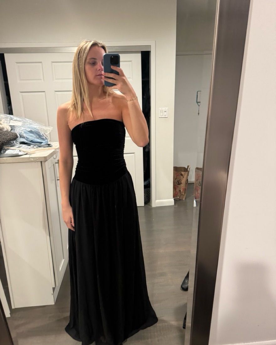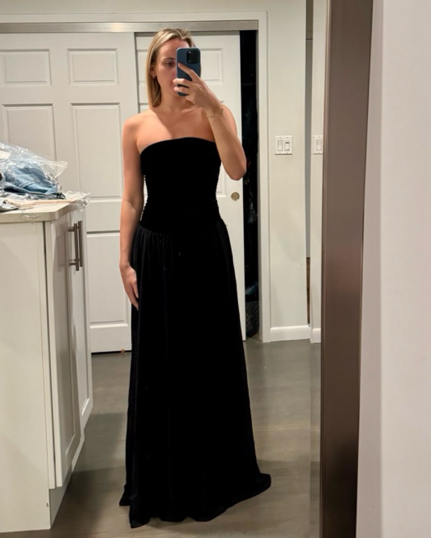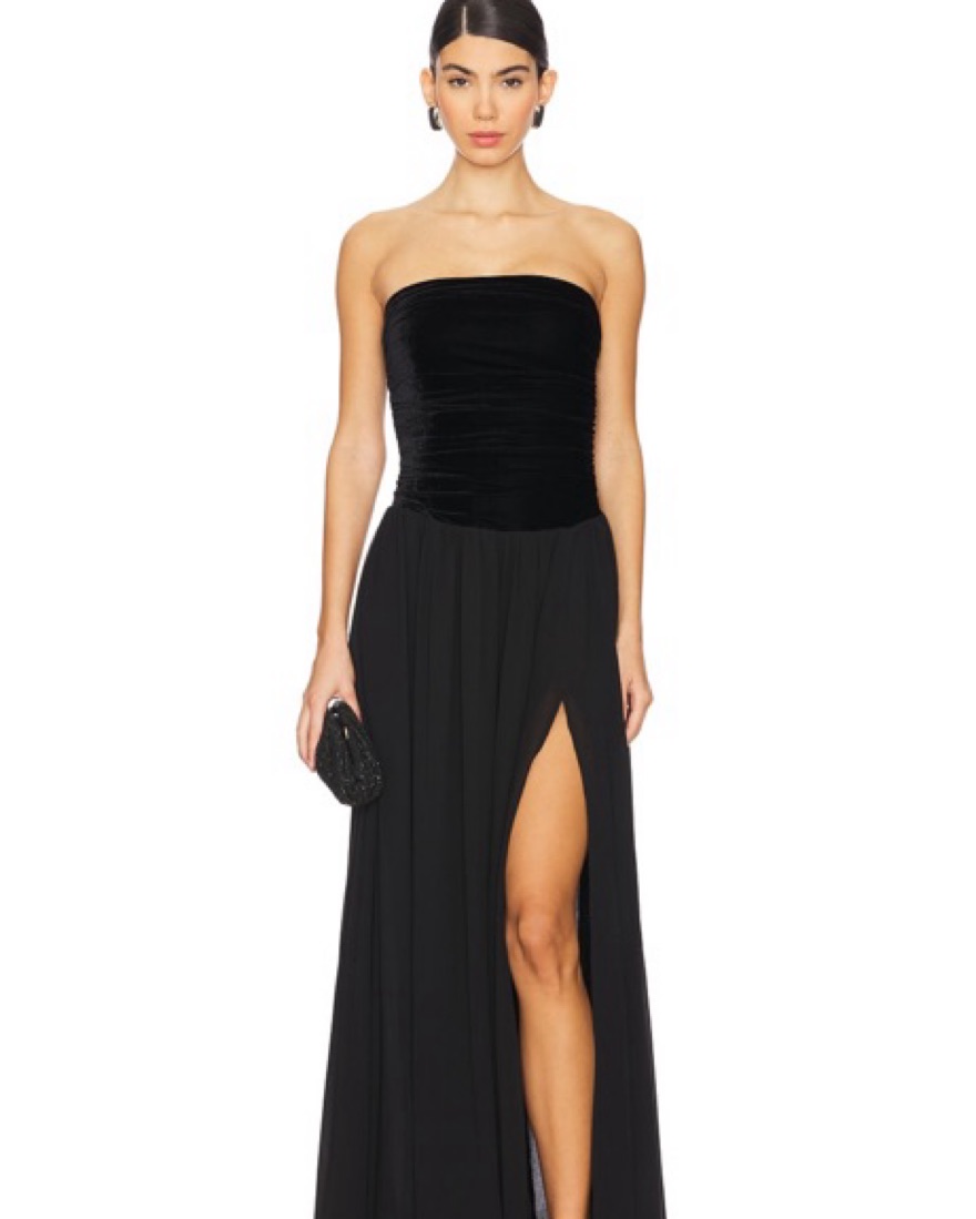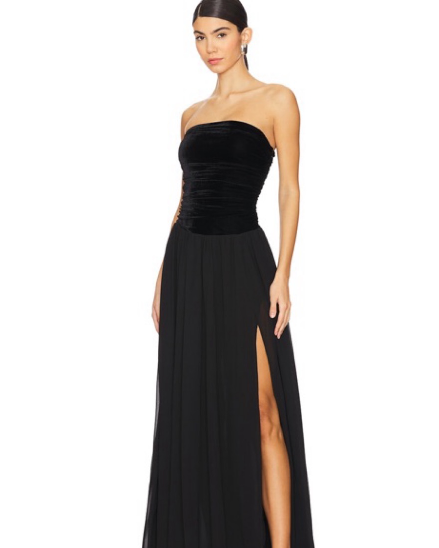 This stunning black strapless gown is perfect for any formal occasion. The ruched velvet and flowing skirt create a flattering and effortless silhouette.