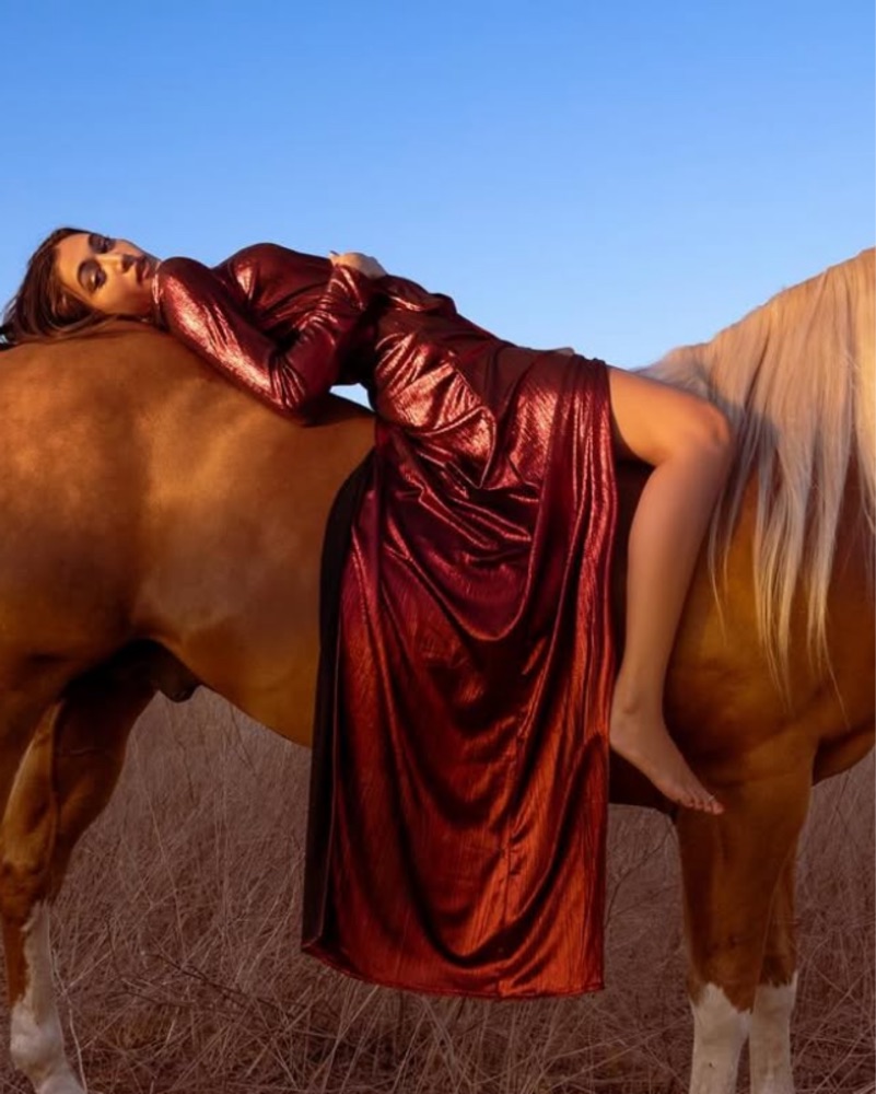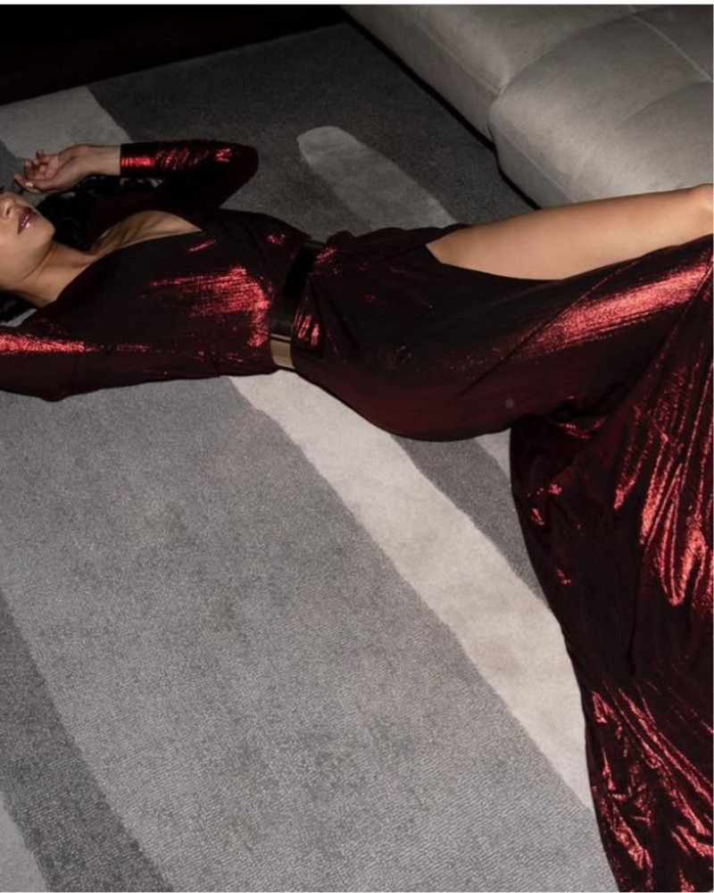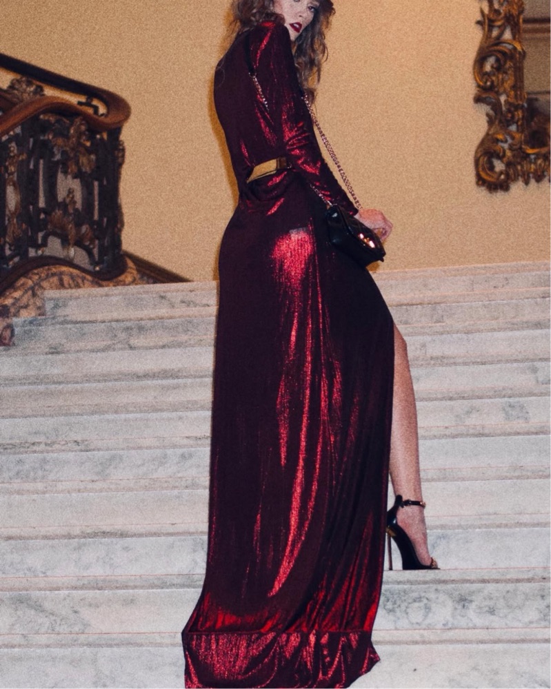 This glamorous shiny red gown is perfect for a special occasion. The deep red color and dramatic silhouette make it a show-stopping choice.