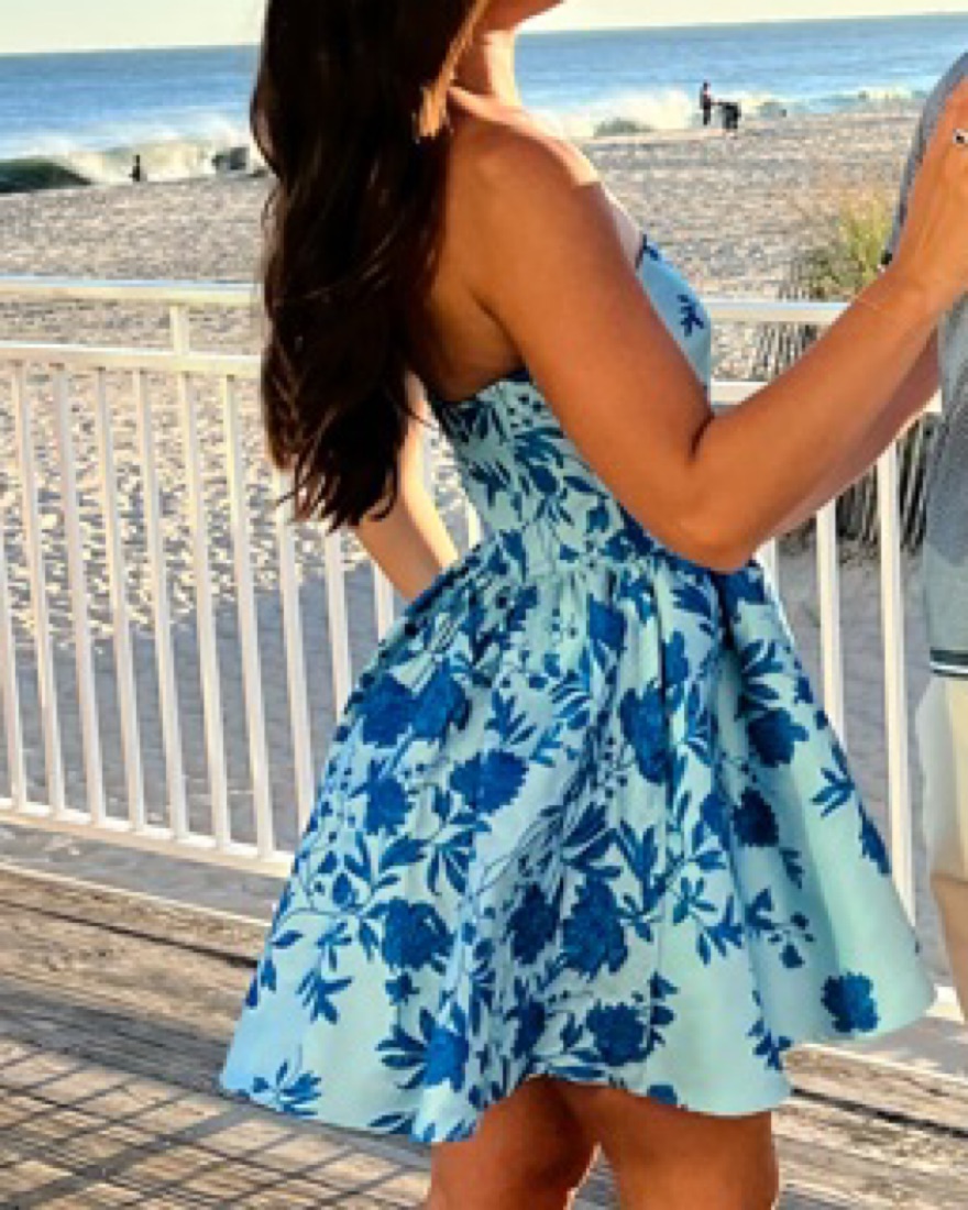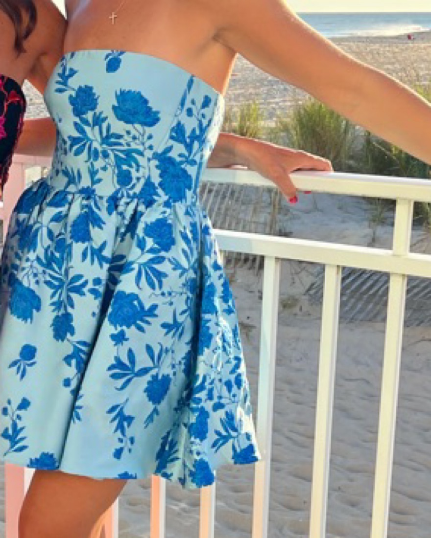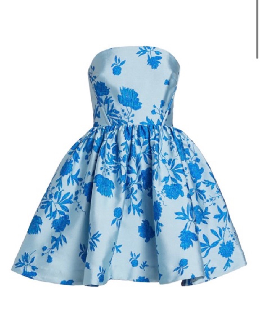 Printed with a splotchy jacquard design, ML Monique Lhuilllier's Kate minidress showcases a dramatic fit-and-flare silhouette. This strapless style features a fitted bodice that flares out with pleats at the waist. *NOTE: I got this dress taken in so it fits a 2. Originally purchased a 4.