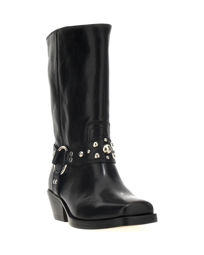 BLACK CALF LEATHER SQUARE TOE STUD-EMBELLISHED HARNESS DEBOSSED LOGO TO THE REAR MID-CALF LENGTH BRANDED LEATHER INSOLE LEATHER LINING 45MM CUBAN HEEL LEATHER SOLE SILVER-TONE HARDWARE SLIP-ON STYLE