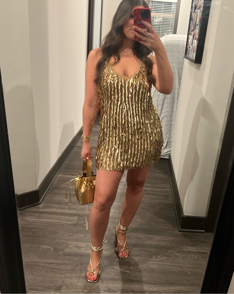 SAROS FEATHER SEQUIN CROCHET DRESS. Size M/L I am a normal size 6. Would fit anywhere from a 6-10. Straps were safety pinned to make them shorter, I am 5’3”.