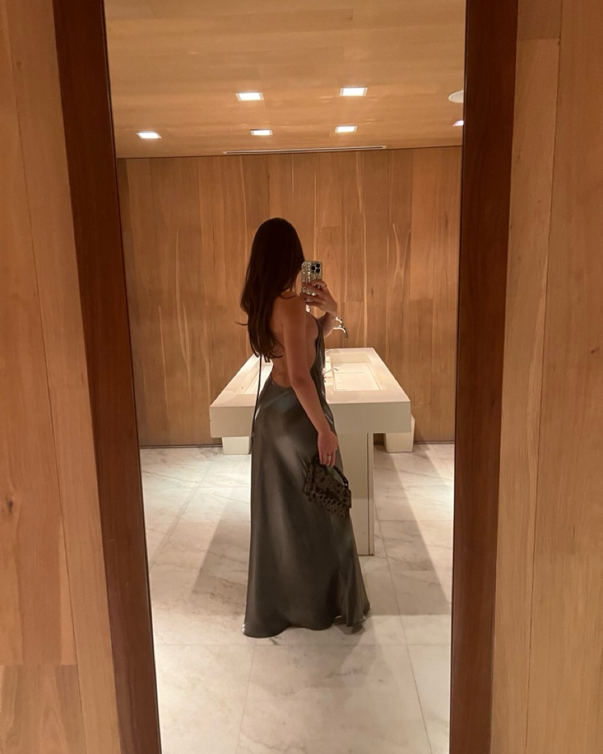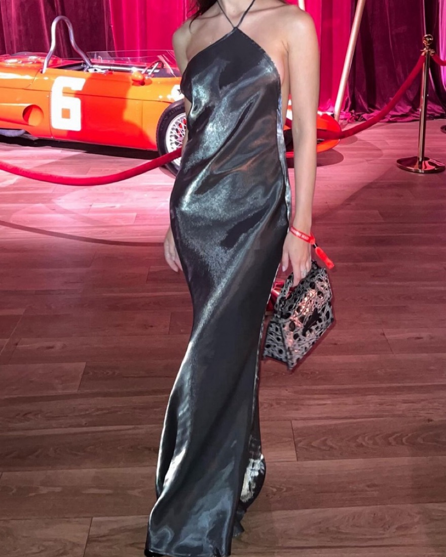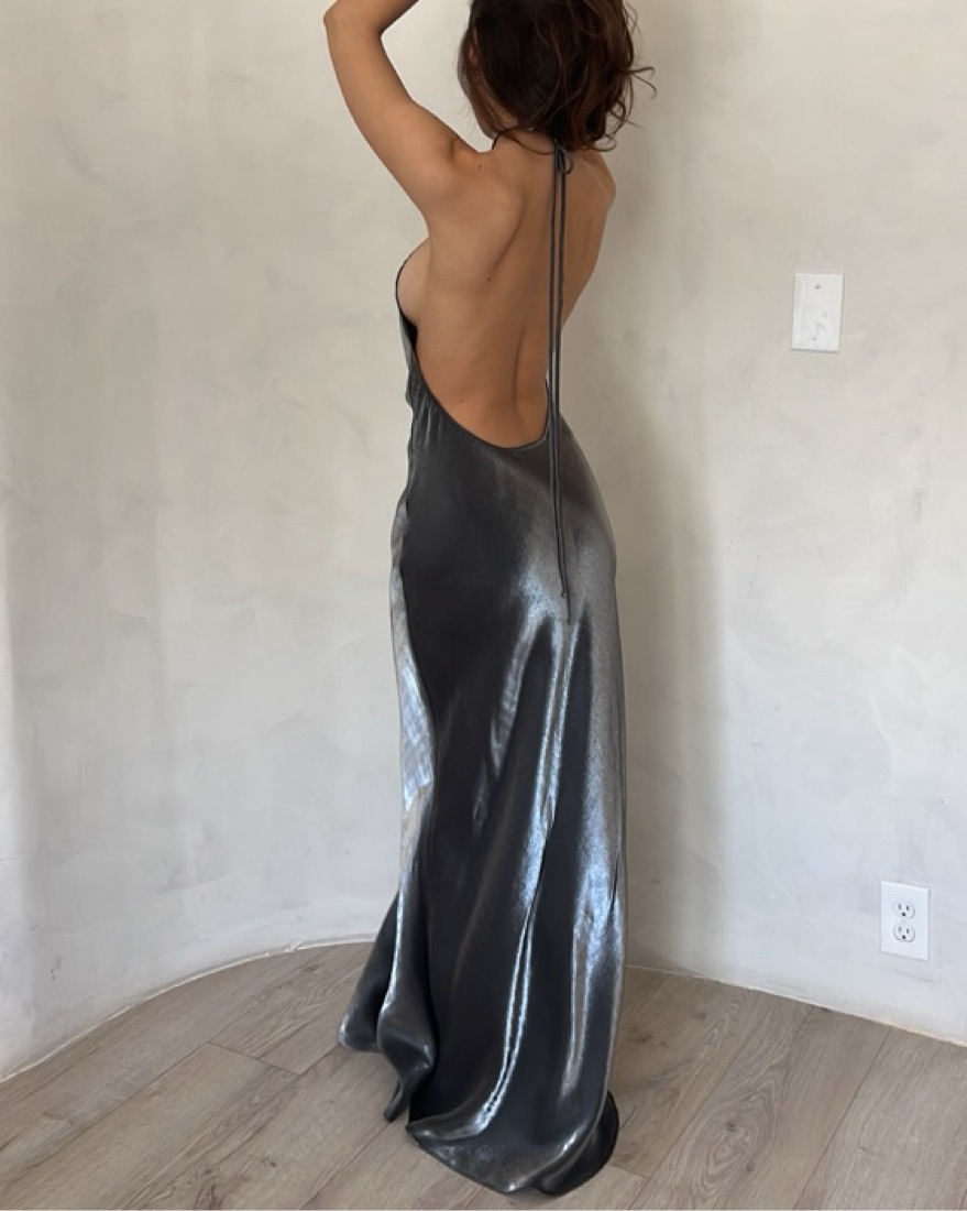 Long flowy silver dress, great for weddings, and formal events. Open back. Recommended for girls that are 5’6 and above. I’m 5’6 (photos 3-6) and model in first photo is 5’7. Can wear with heels and the dress still kisses the floor.