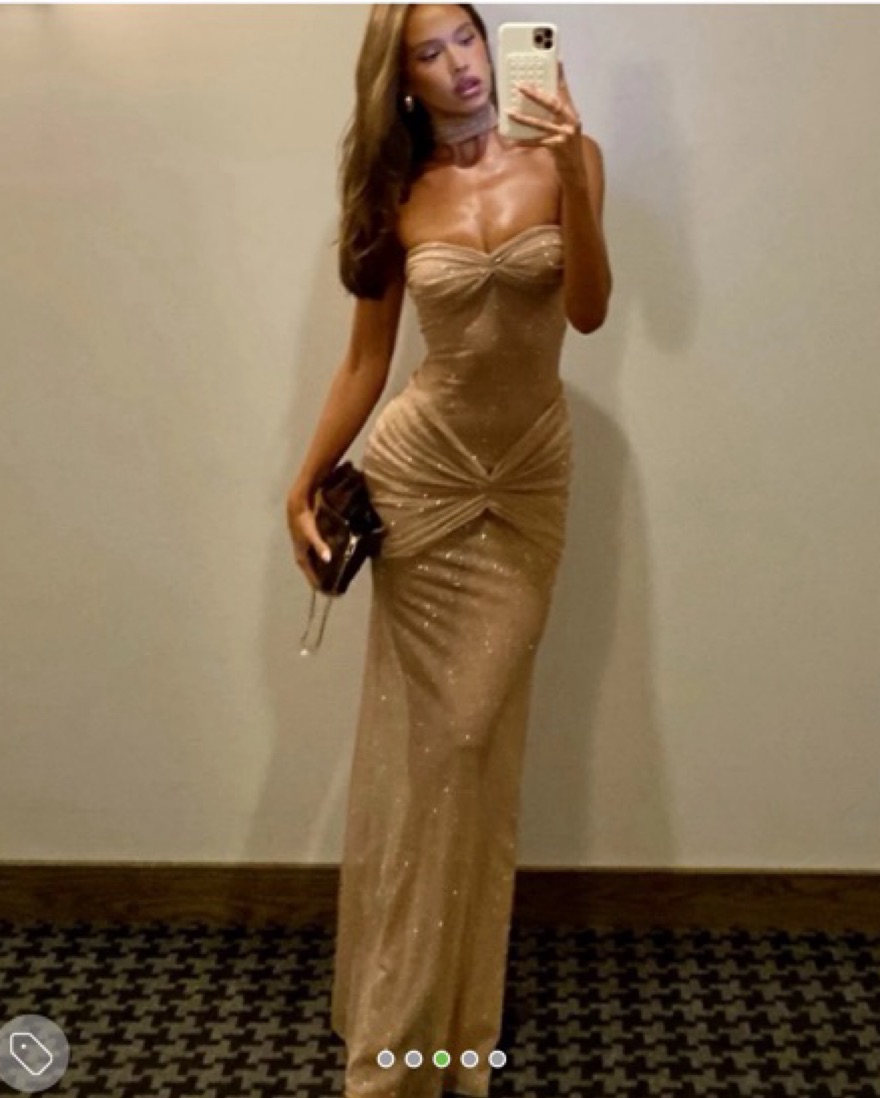 Strapless stretch gown with collar. Silicon Gripper along neckline. Invisible zipper with hook and eye center back.