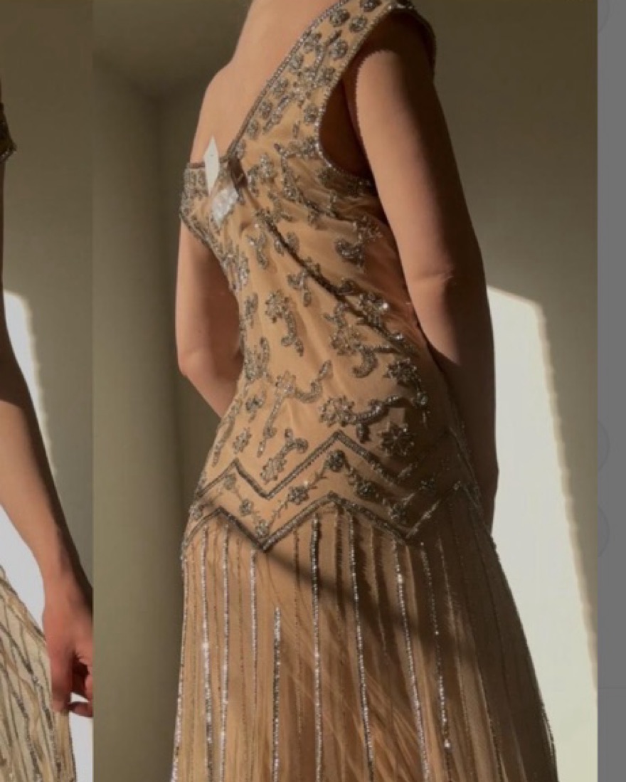 Insanely detailed nude colored dress! Love everything about this garment. Has a matching underdress, but the top layer is embellished mesh, best fits an 8-10