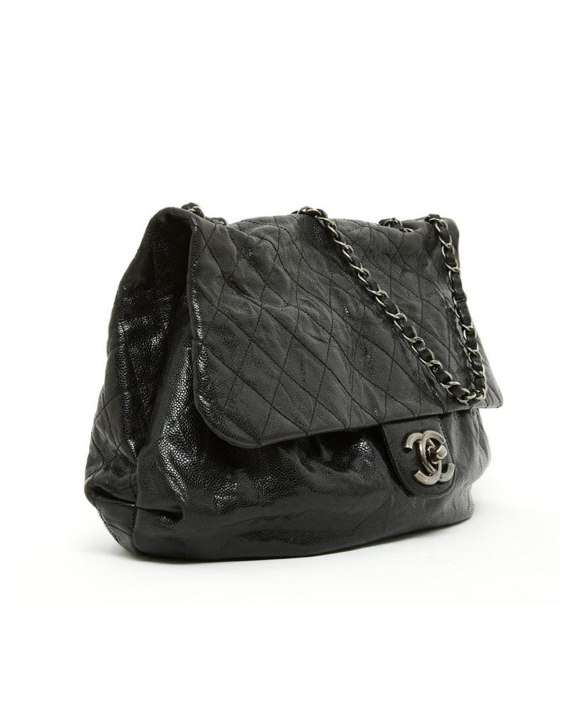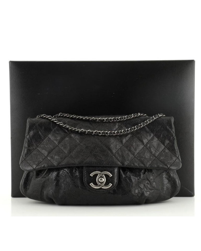 Vintage Chanel Quilted Glazed Leather Elastic CC Medium Flap Bag. Chic unstructured, semi-slouchy fit. Has a beautiful minor black lustrous finish. Silver hardware. 100% Authentic.